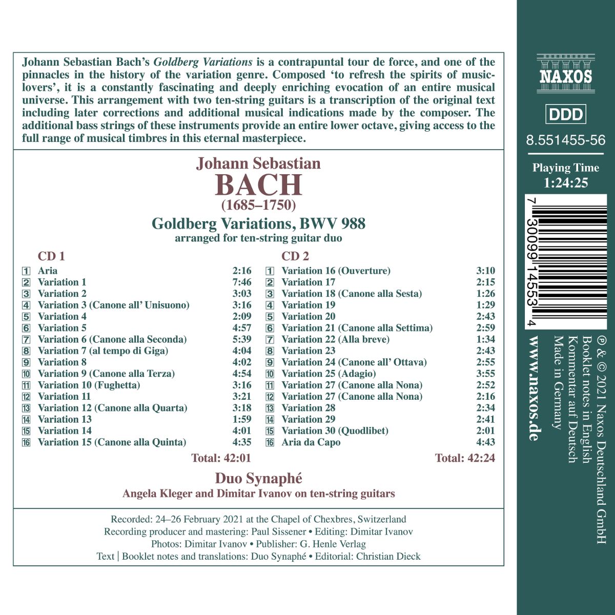 Die „Goldberg-Variationen“ von Johann Sebastian Bach, „den Liebhabern zur Gemüths-Ergötzung“ gewidmet, sind ein kontrapunktischer Geniestreich und einer der absoluten Höhepunkte der Variationskunst. Das hier zu hörende Arrangement für zwei 10-saitige Gitarren, dss das Duo Synaphé (Angela Kleger und Dimitar Ivanov) selbst erstellt hat, ist eine Originaltext-nahe Transkription der überarbeiteten Fassung mit den späteren Korrekturen und ergänzenden Angaben. Die Basssaiten der Instrumente stellen eine zusätzliche tiefe Oktave zur Verfügung, die das Umsetzen des vollständigen Tonumfangs der Komposition ermöglicht.