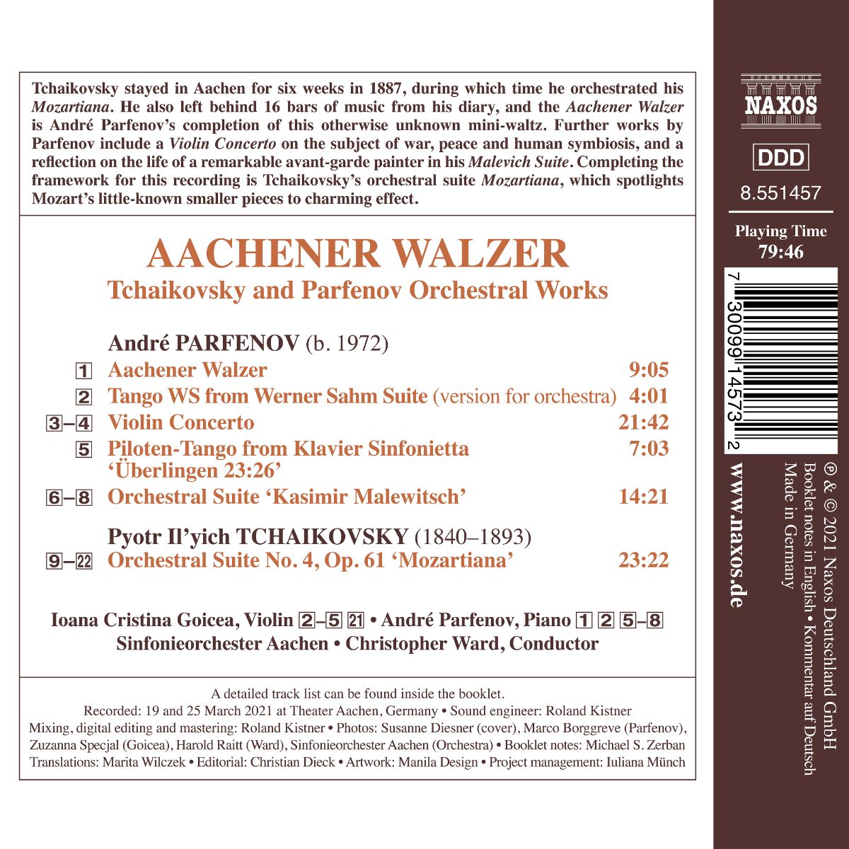 Pjotr Iljitsch Tschaikowsky hielt sich 1887 sechs Wochen lang in Aachen auf und orchestrierte in dieser Zeit seine bekannte Orchestersuite „Mozartiana“. Darüber hinaus hinterließ er auch 16 Takte Musik in seinem Tagebuch, die der russisch-deutsche Komponist André Parfenov zum „Aachener Walzer“ vervollständigt hat. Das Album ist eine Reise zurück in die Vergangenheit und startet vom aktuellen Walzer über weitere Orchesterwerke Parfenovs, darunter sein Violinkonzert (mit der Solistin Ioana Cristina Goicea) und endet, natürlich bei der „Mozartiana“ selbst, die ihrerseits eine Zeitreise ist, stellt sie doch wenig bekannte kleinere Stücke Mozarts in den Mittelpunkt.