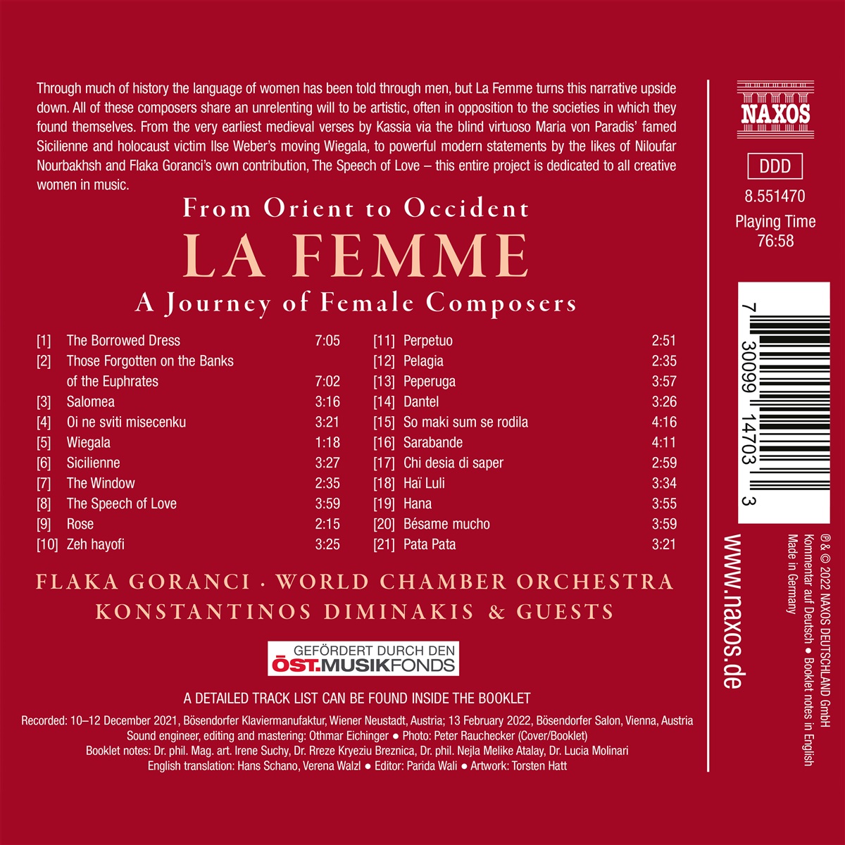 Die wissenschaftlichen, politischen und künstlerischen Erfolge von Frauen wurden lange Zeit ignoriert oder relativiert, Frauenerfolge wurden Männern im Hintergrund zugeschrieben, biographische Dokumente vernichtet, herausragende Frauen wurden zu Außenseiterinnen, Ausnahmeerscheinungen oder Dilettantinnen erklärt. Was die Frauen der Werke auf „La Femme“ verbindet, ist der unerbittliche Wille, künstlerisch tätig zu sein, gegen alle Widerstände von Familie und männlichem Establishment. Die Mezzosopranistin Flaka Goranci und das World Chamber Orchestra unter der Leitung von Konstantinos Diminakis laden zu einer alternativen Reise durch die Musikgeschichte ein, bei der man viele Vorurteile über Bord werfen wird.