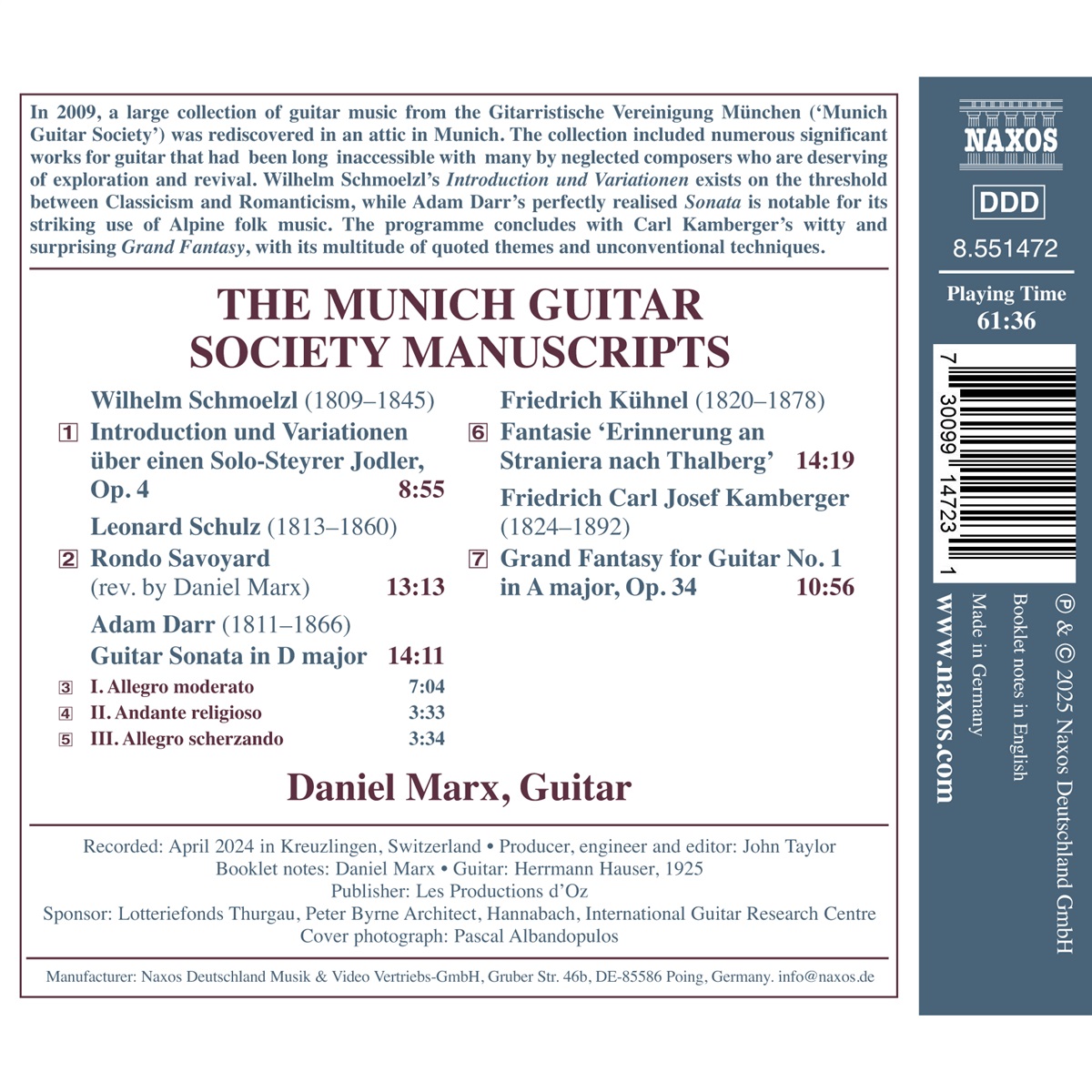 Im Jahr 2009 wurde auf einem Dachboden in München eine umfangreiche Sammlung von Gitarrenmusik der Gitarristischen Vereinigung München wiederentdeckt. Die Sammlung umfasst zahlreiche bedeutende Werke für Gitarre, die lange Zeit unzugänglich waren, darunter viele von vernachlässigten Komponisten, die es verdienen, wiederentdeckt und wiederaufgeführt zu werden. Einige Höherpunkte: Wilhelm Schmoelzls „Introduction und Variationen“ steht an der Schwelle zwischen Klassik und Romantik, während Adam Darr mit seiner perfekt ausgearbeiteten „Sonate“ durch die eindrucksvolle Verwendung alpiner Volksmusik besticht. Den Abschluss des Programms bildet Carl Kambergers witzige und überraschende „Große Fantasie“ mit ihren zahlreichen zitierten Themen und unkonventionellen Techniken. Dieses Programm für Sologitarre ist vollgepackt mit seltenem und unentdecktem Repertoire aus dem Archiv der Gitarristischen Vereinigung München, das heute in der Bayerischen Staatsbibliothek in München aufbewahrt wird und bisher nur in Manuskriptform existiert und daher der breiten Gitarrenszene und der Musikwelt im Allgemeinen unbekannt ist. Der Gitarrist Daniel Marx ist bekannt für seine Transkriptionen, Arrangements und Entdeckungen und kann als perfekter Verfechter dieses „brandneuen“ Repertoires angesehen werden. Marx' internationale Karriere ist gespickt mit Siegen bei internationalen Wettbewerben, Preisen und Stipendien in Europa und Amerika.