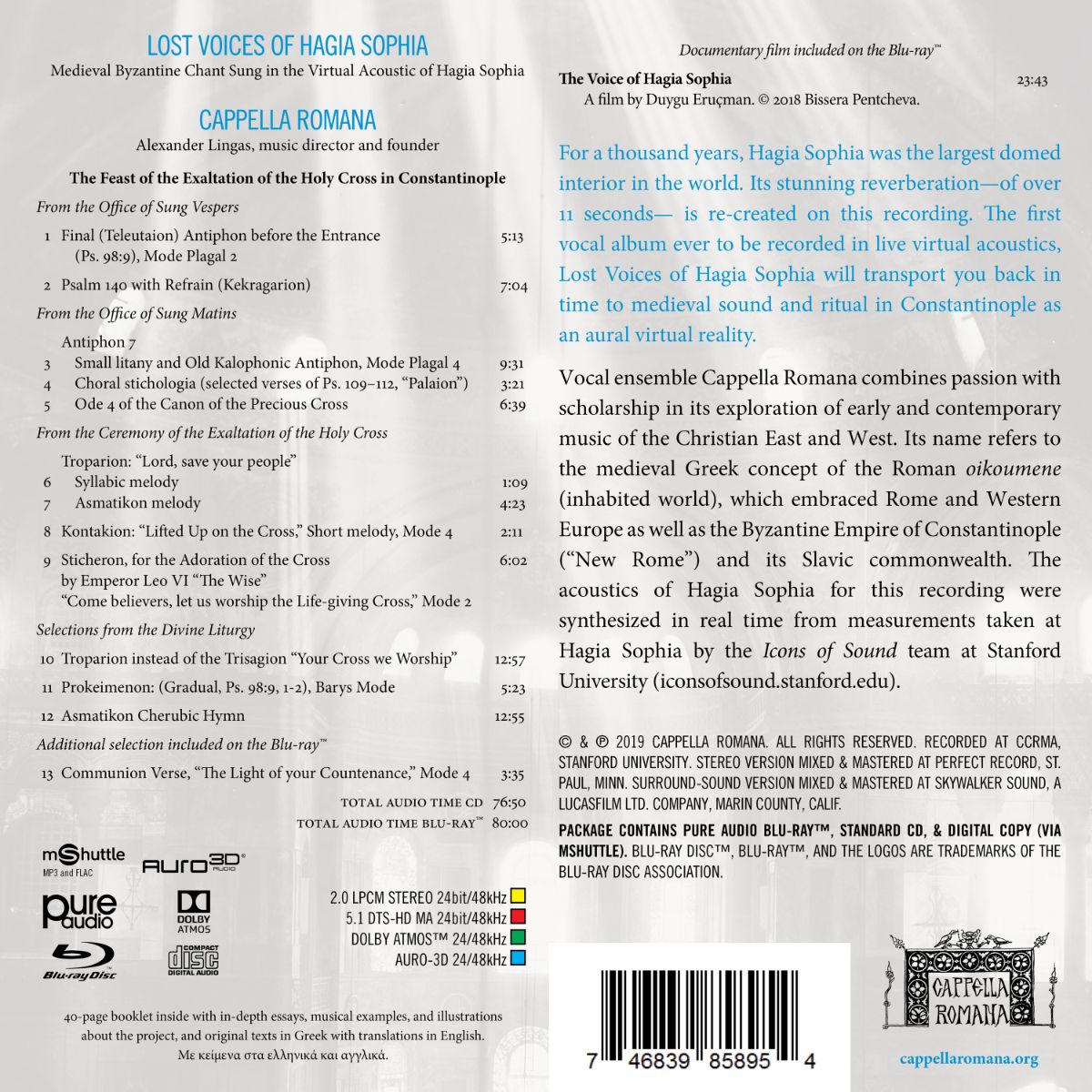 Die einzigartigen architektonischen Bedingungen der Hagia Sophia waren der zentraler Faktor für die Entwicklung der liturgischen Musik griechisch-orthodoxen Musik byzantinischer Prägung. Mittels modernster Technik ist es nun dem amerikanischen Chor Cappella Romana gelungen, die einzigartige Akustik der Hagia Sophia virtuell präzise neu zu erschaffen. Sie wurde für „Lost Voices of Hagia Sophia“ vom Icons-of-Sound-Team der Stanford University vermessen und analysiert und bei der Aufführung von Cappella Romana in Echtzeit akustisch umgesetzt. Man erhält einen perfekten akustischen Eindruck der byzantinischen Liturgie-Musik, die vor über 500 Jahren in der Hagia Sophia verstummte.