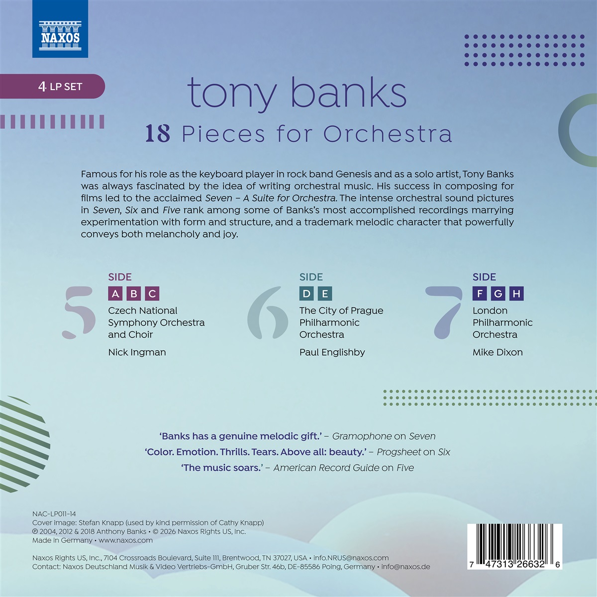 Tony Banks, der durch seine Rolle als Keyboarder der Rockband Genesis und als Solokünstler bekannt wurde, war schon immer von der Idee fasziniert, Orchestermusik zu schreiben. Sein Erfolg beim Komponieren für Filme führte zu dem gefeierten „Seven - A Suite for Orchestra“. Die intensiven orchestralen Klangbilder in „Seven“, „Six“ und „Five“ gehören zu den gelungensten Aufnahmen von Banks. Sie vereinen das Experimentieren mit Form und Struktur mit einem charakteristischen melodischen Charakter, der sowohl Melancholie als auch Freude kraftvoll vermittelt. Diese Zusammenstellung von 18 Orchesterwerken ist nun auch auf Vinyl erhältlich. Tony Banks ist Gründungsmitglied von Genesis, zusammen mit seinen Charterhouse-Schülern Mike Rutherford, Peter Gabriel und Anthony Phillips. Die Band entwickelte sich mit der Aufnahme von Phil Collins und Steve Hackett weiter. Genesis wurde in den frühen 1970er Jahren zu einem der wichtigsten Vertreter der progressiven Rockmusik und entwickelte sich nach dem Ausscheiden Gabriels zu einer der kommerziell erfolgreichsten Bands der 1980er und 1990er Jahre. Tony Banks hat im Laufe seiner Karriere viele einzigartige Keyboard- und Synthesizer-Sounds entwickelt. Der Musikhistoriker Wayne Studer bezeichnete ihn als „den geschmackvollsten Keyboarder des Progrock‟. Diese Aufnahmen werden seit jeher für ihre eloquente und stilvolle Orchestrierung und die opulenten Darbietungen von Weltklasse-Solisten geschätzt, darunter Tony Banks selbst, der in „Five“ Klavier und Celeste spielt, neben den renommierten Musikern des London Philharmonic Orchestra, des Czech National Symphony Choir and Orchestra und des City of Prague Philharmonic Orchestra.
