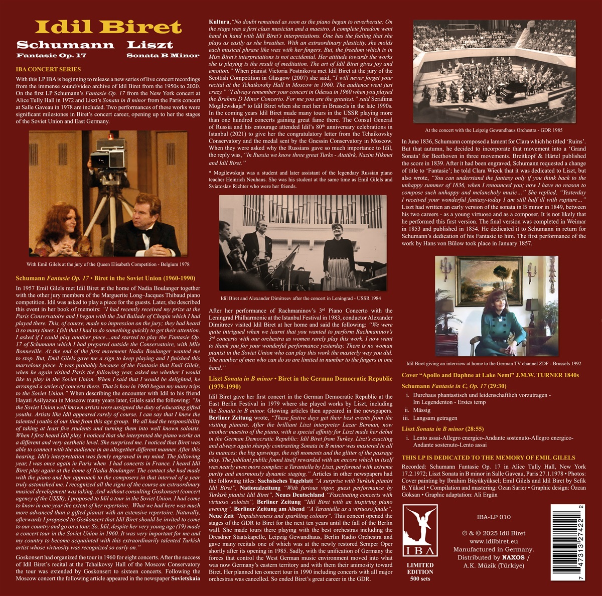 Diese besondere Veröffentlichung vereint wegweisende Aufnahmen aus Idil Birets umfangreichen Konzerttourneen hinter dem Eisernen Vorhang zwischen 1964 und 1990, einer Zeit, in der sie Robert Schumann und Franz Liszt in den renommiertesten Konzertsälen der Sowjetunion und Ostdeutschlands spielte. Ermutigt durch Legenden wie Emil Gilels und Nadia Boulanger wurde Biret zur musikalischen Botschafterin im geteilten Europa – sie gab Konzerte in Leningrad, Leipzig, Dresden und Moskau, darunter ein im Fernsehen übertragenes Konzert im Jahr 1976 und Auftritte mit dem Gewandhausorchester Leipzig. Hier sind zwei der wichtigesten Werke des romantischen Repertoires zu hören: Schumanns „Fantasie in C“, Op. 17 und Liszts „Sonate in h-Moll“. Diese Aufnahmen fangen die Intensität und emotionale Tiefe der Interpretationen Birets ein. Idil Biret begann ihre Karriere als Solistin im Alter von sechzehn Jahren und trat mit großen Orchestern in den wichtigsten Musikzentren der Welt auf, darunter das Boston Symphony Orchestra und die Leningrader Philharmoniker, in Zusammenarbeit mit Dirigenten von höchstem Rang. Sie wurde mit vielen wichtigen Preisen und Ehrungen ausgezeichnet, beispielsweise dem französischen Chevalier de l’Ordre National du Mérite und sie erhielt die Auszeichnung „Staatskünstlerin” in der Türkei.