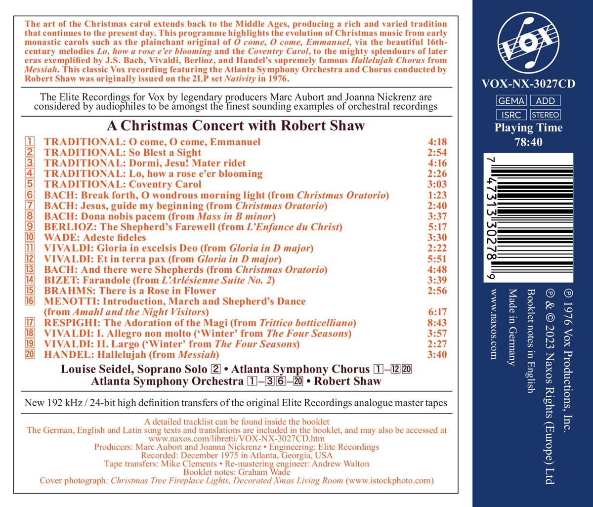 Die Kunst des Weihnachtsliedes entstand im Mittelalter und so verfügen wir heute über einen reichen Schatz an ganz unterschiedlichen Stücken. Dieses Album folgt der Evolution der Weihnachtsmusik von den frühen Gesängen der Mönche wie beispielsweise „O come, O come, Emmanuel“ aus dem 8./ 9. Jahrhundert über die Lieder „Lo, how a rose e’er blooming“ und „Coventry Carol“ aus dem 16. Jahrhundert bis zu barocker und romantischer Musik von Komponisten wie Johann Sebastian Bach, Antonio Vivaldi und Hector Berlioz. Als krönender Abschluss schließt Georg Friedrich Händels „Hallelujah“ das Album ab. Diese Aufnahmen mit dem Atlanta Symphony Orchestra & Chorus aus dem Jahr 1975 sind ein wiedergefundener Schatz der Musikgeschichte – nun in bester Remastering-Qualität.
