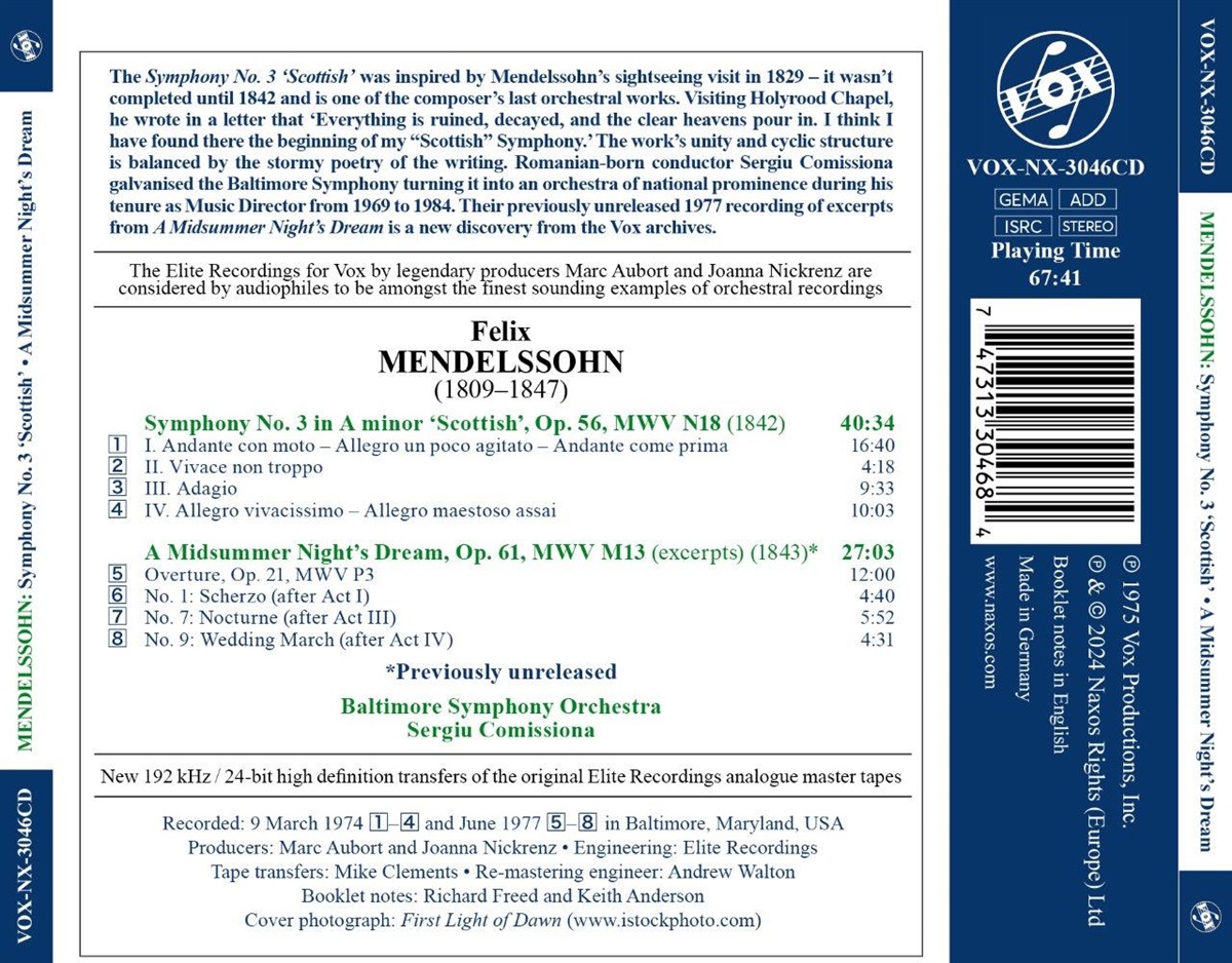 Die Sinfonie Nr. 3 („Schottische“) wurde von Mendelssohns Besuch im Jahr 1829 inspiriert - sie wurde erst 1842 fertiggestellt und ist eines der letzten Orchesterwerke des Komponisten. Als er die Holyrood Chapel besuchte, schrieb er in einem Brief: „Alles ist ruiniert, verfallen, und der klare Himmel strömt herein. Ich glaube, ich habe dort den Anfang meiner „schottischen“ Symphonie gefunden.' Die Einheit und zyklische Struktur des Werks wird durch die stürmische Poesie des Textes ausgeglichen. Der in Rumänien geborene Dirigent Sergiu Comissiona hat das Baltimore Symphony Orchestra während seiner Amtszeit als Musikdirektor von 1969 bis 1984 zu einem Orchester von nationaler Bedeutung gemacht. Ihre bisher unveröffentlichte Aufnahme von Auszügen aus „Ein Sommernachtstraum“ aus dem Jahr 1977 ist eine Neuentdeckung aus den Vox-Archiven und wird nun erstmals auf einem anderen Format veröffentlicht. Betreut von Marc Aubort und Joanna Nickrenz gelten diese Vox-Aufnahmen als audiophile Klassiker. Seit über einem Jahrhundert gilt das Baltimore Symphony Orchestra (BSO) als eines der führenden Orchester Amerikas und als eine der bedeutendsten kulturellen Einrichtungen Marylands. Das BSO konzentriert sich auf erstklassige Aufführungen, gesellschaftliches Engagement und musikalische Bildung für Kinder. Das BSO tritt jährlich für mehr als 350.000 Menschen im gesamten Bundesstaat Maryland auf. Der in Rumänien geborene Dirigent Sergiu Comissiona debütierte im Alter von 18 Jahren als Dirigent des Orchesters der Bukarester Oper. Als er 22 Jahre alt war, wurde er Musikdirektor des Rumänischen Staatsensembles und fünf Jahre später wurde er Chefdirigent der Rumänischen Staatsoper. 1959 floh Comissiona vor dem kommunistischen Regime in Rumänien und emigrierte nach Israel, wo er Musikdirektor der Haifa Symphony wurde. Im folgenden Jahr gründete er das Israel Chamber Orchestra, mit dem er Aufnahmen machte und durch Europa und Amerika tourte.