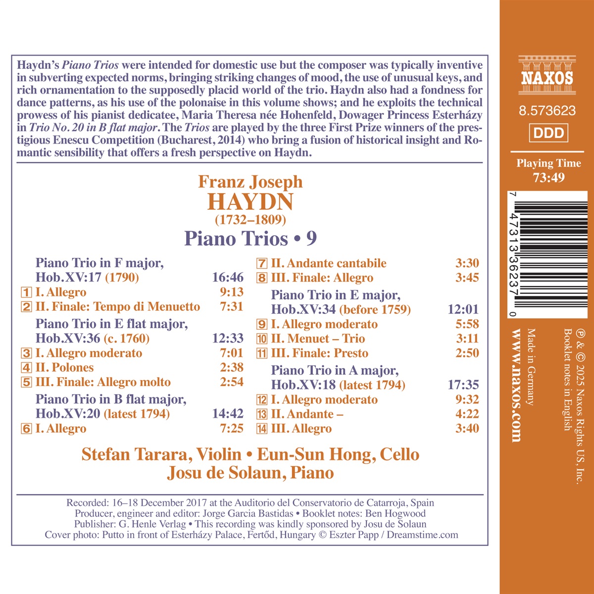Joseph Haydns Klaviertrios waren für den Hausgebrauch bestimmt, aber der Komponist war erfinderisch darin, erwartete Normen zu unterlaufen, indem er auffällige Stimmungswechsel, die Verwendung ungewöhnlicher Tonarten und reichhaltige Verzierungen in die vermeintlich ruhige Welt des Trios einbrachte. Haydn hatte auch eine Vorliebe für Tanzmuster, wie seine Verwendung der Polonaise auf diesem Album zeigt, und er nutzte die technischen Fähigkeiten seiner Pianistin Maria Theresa, geborene Hohenfeld, Witwe des Fürsten Esterházy, in Trio Nr. 20 in B-Dur. Die Trios werden von den drei Erstplatzierten des renommierten Enescu-Wettbewerbs (Bukarest, 2014) gespielt, die eine Verschmelzung von historischem Verständnis und romantischer Sensibilität bieten, die eine neue Perspektive auf Haydn eröffnet. Der Geiger Stefan Tarara ist sowohl als Solist als auch in Kammermusikensembles tätig. Seine Auftritte führen ihn regelmäßig zu großen Festivals und Konzertsälen auf der ganzen Welt, wie zum Beispiel zum Schleswig-Holstein Musik Festival, den Salzburger Festspielen oder der Tonhalle Zürich. Die Cellistin Eun-Sun Hong hat mit vielen internationalen Orchestern gespielt, darunter das Orchestra Filarmonica della Fenice, die George Enescu Philharmonic sowie die Russische und die Tokioter Philharmonie. Sie trat in berühmten Konzertsälen wie dem Konzerthaus Berlin, dem Musikverein Wien, der Wigmore Hall, dem Rumänischen Athenäum und dem Théâtre des Champs-Élysées auf. Der Pianist, Komponist und Dirigent Josu de Solaun ist einer der führenden jungen Pianisten der Gegenwart und trat bereits mit vielen internationalen Orchestern und Dirigenten auf.