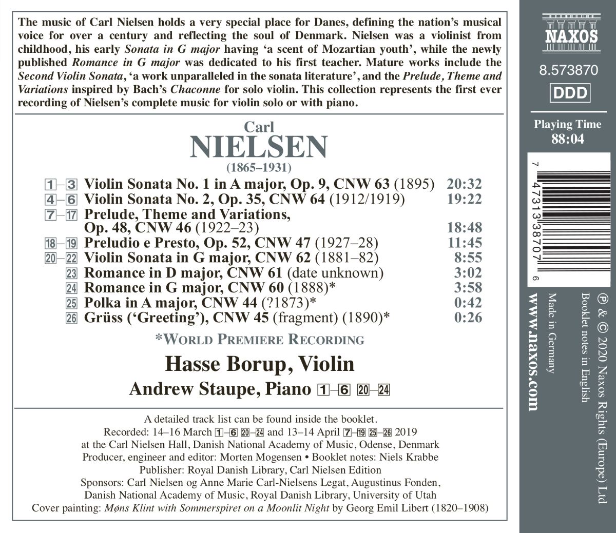 Carl Nielsen war von Kindheit an Violinist. Die frühe Sonate des 14-jährigen Carl in G-Dur hat einen „Hauch von mozartscher, jugendlicher Unbeschwertheit, seine zweite Violinsonate aus dem Jahre 1912 (rev. 1919) gehört zu seinen bekanntesten und komplexesten Kammerwerken überhaupt. Seine Werke für Solovioline („Präludium und Thema mit Variationen für Violine solo“ und das „Preludio e presto für Violine solo“) fallen in seine späte, etwas experimentellere Phase.