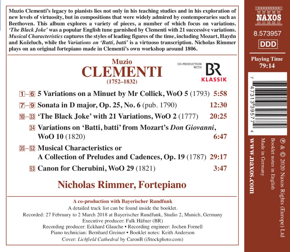 „The Black Joke“ war eine beliebte englische Melodie, die Clementi mit 21 aufeinanderfolgenden Variationen ausschmückte. „Musical Characteristics“ imitiert die Stile der führenden Komponisten der Zeit, darunter Mozart, Haydn und Koželuch, während die Variationen über die „Batti, batti“-Arie aus Mozarts „Don Giovanni“ ein Meisterstück der virtuosen Transkriptions- und Variationskunst sind.