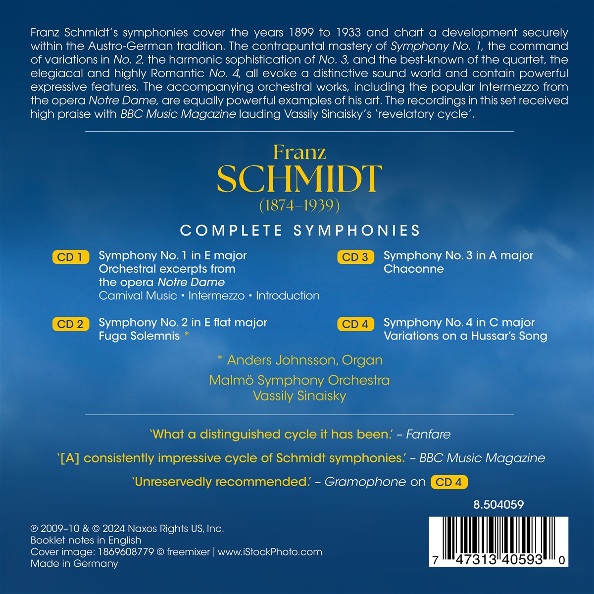 Franz Schmidts Sinfonien entstanden zwischen 1899 und 1933 und stellen eine Entwicklung dar, die fest in der deutsch-österreichischen Tradition steht. Die kontrapunktische Meisterschaft der Sinfonie Nr. 1, die Beherrschung der Variationen in der zweiten Sinfonie, die harmonische Raffinesse der dritten Sinfonie und die bekannteste des Quartetts, die elegische und hochromantische Sinfonie Nr. 4, beschwören alle eine unverwechselbare Klangwelt herauf und enthalten starke Ausdrucksmerkmale. Die begleitenden Orchesterwerke, darunter das beliebte Intermezzo aus der Oper „Notre Dame“, sind ebenso kraftvolle Beispiele seiner Kunst. Die Aufnahmen dieses Sets, die bisher zwischen 2009 und 2010 einzeln veröffentlicht wurden, wurden vom BBC Music Magazine hoch gelobt, das Vassily Sinaiskys ‚enthüllenden Zyklus‘ lobte.