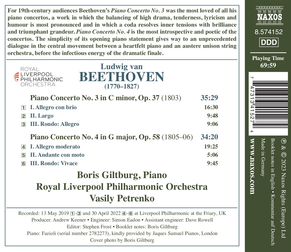 Für das Publikum des 19. Jahrhunderts war Beethovens 3. Klavierkonzert das beliebteste aller fünf Konzerte. Es ist ein Werk, in dem die Balance zwischen hoher Dramatik, Zartheit, Lyrik und Humor am stärksten ausgeprägt ist und in dem eine Coda die inneren Spannun-gen mit Brillanz und triumphaler Größe auflöst. Das Klavierkonzert Nr. 4 ist dazu quasi ein Gegenentwurf: Introspektiv und poetisch verweist es mit seiner Klangsprache auf die Romantik. Die Schlichtheit des einleitenden Klaviersatzes weicht einem im Mittelsatz einem beispiellosen Dialog zwischen einem gefühlvollen Klavier und einem Unisono-Streichorchester, bevor die ansteckende Energie des dra-matischen Finales einsetzt. Mit der Einspielung dieser beiden beliebten Werke, beschließt Boris Giltburg seinen kleinen Zyklus mit sämtlichen Klavierkonzerten Beethovens.
