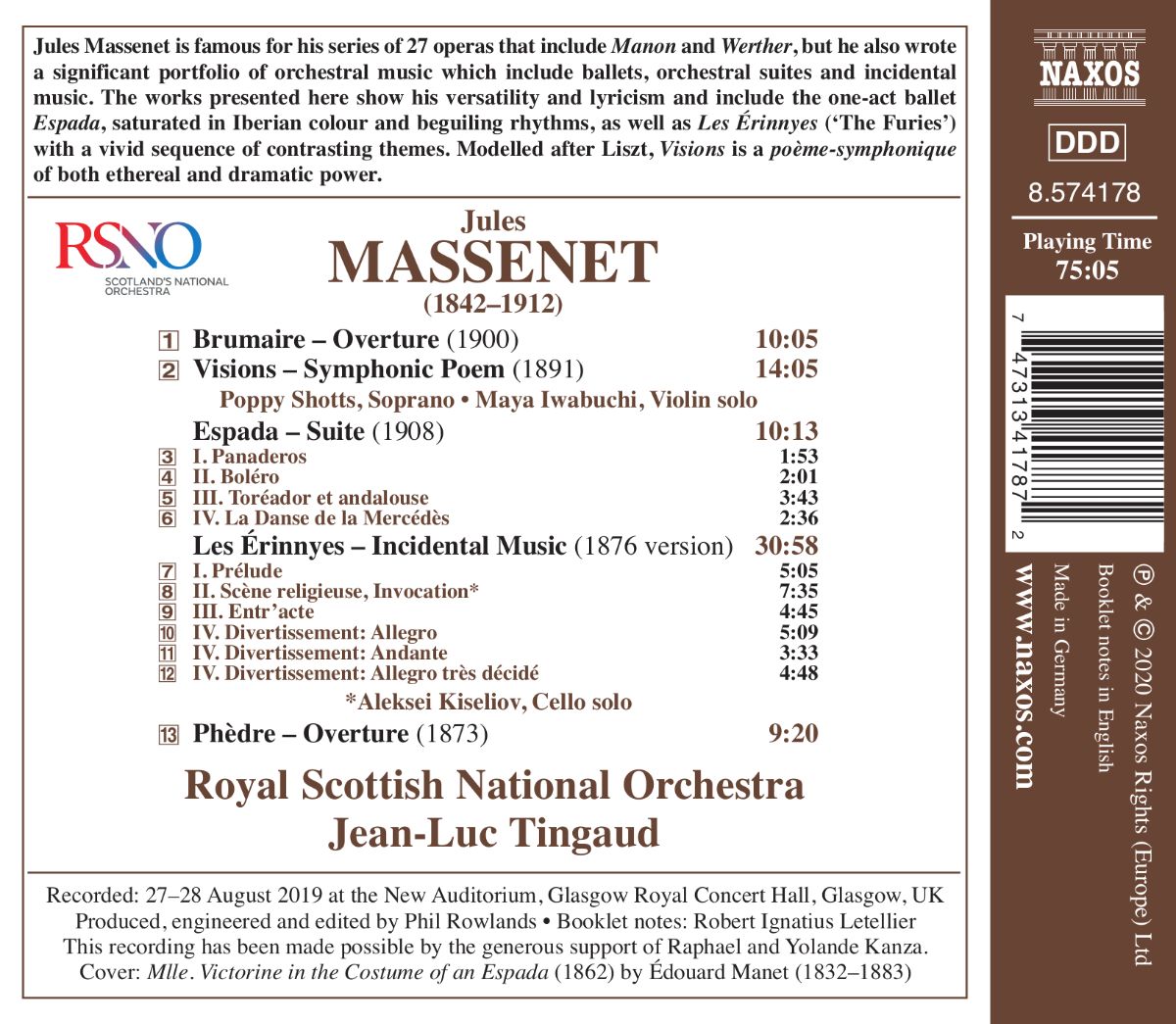 Die auf dem Album vorgestellten Werke zeigen Massenets Vielseitigkeit und belegen seine überaus poetische Klangsprache. Zu hören ist die Musik zum einaktigen Ballett „Espada“, das von iberischen Farben und betörenden Rhythmen durchdrungen ist sowie „Les Érinnyes“ (zu Deutsch: „Die Furien§) mit einer lebhaften Abfolge kontrastierender Themen. Nach dem Vorbild Liszts ist „Visions“ – das zentrale Werk des Albums – eine Tondichtung, ein poème-symphonique von ätherischer und dramatischer Kraft.