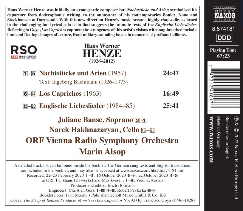 Hans Werner Henze war ursprünglich ein Avantgarde-Komponist, aber die „Nachtstücke und Arien“ symbolisierten seine Abkehr von der Zwölftontechnik, sehr zum Ärger seiner Zeitgenossen Boulez, Nono und Stockhausen. Mit dieser neuen Richtung wurde Henzes Musik rhapsodisch, wie in dem anspruchsvollen, lyrischen Cellopart der „Englischen Liebeslieder“ zu hören ist. In Anlehnung an Goya fängt „Los Caprichos“ die Fremdartigkeit der Visionen des Malers mit langen, melodischen Linien und flüchtigen Texturwechseln ein, von militärisch anmutender Betriebsamkeit bis tiefen Stille.