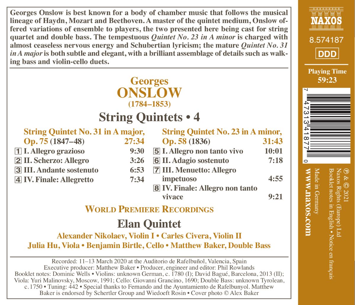 Georges Onslow ist heute vor allem für seine Kammermusik bekannt, die in einer direkten musikalischen Linie von Haydn, Mozart und Beethoven steht. Als Meister des Quintetts bot Onslow den Musikern verschiedene Besetzungsvarianten an, die beiden hier vorgestellten sind für Streichquartett und Kontrabass. Das stürmische Quintett Nr. 23 in a-Moll ist mit nahezu unermüdlicher nervöser Energie und schubertscher Lyrik aufgeladen; das reifere Quintett Nr. 31 in A-Dur ist sowohl subtil als auch elegant, mit reizvollen Details wie einem ‚Walking Bass' und verspielten Violin-Cello-Duetten.