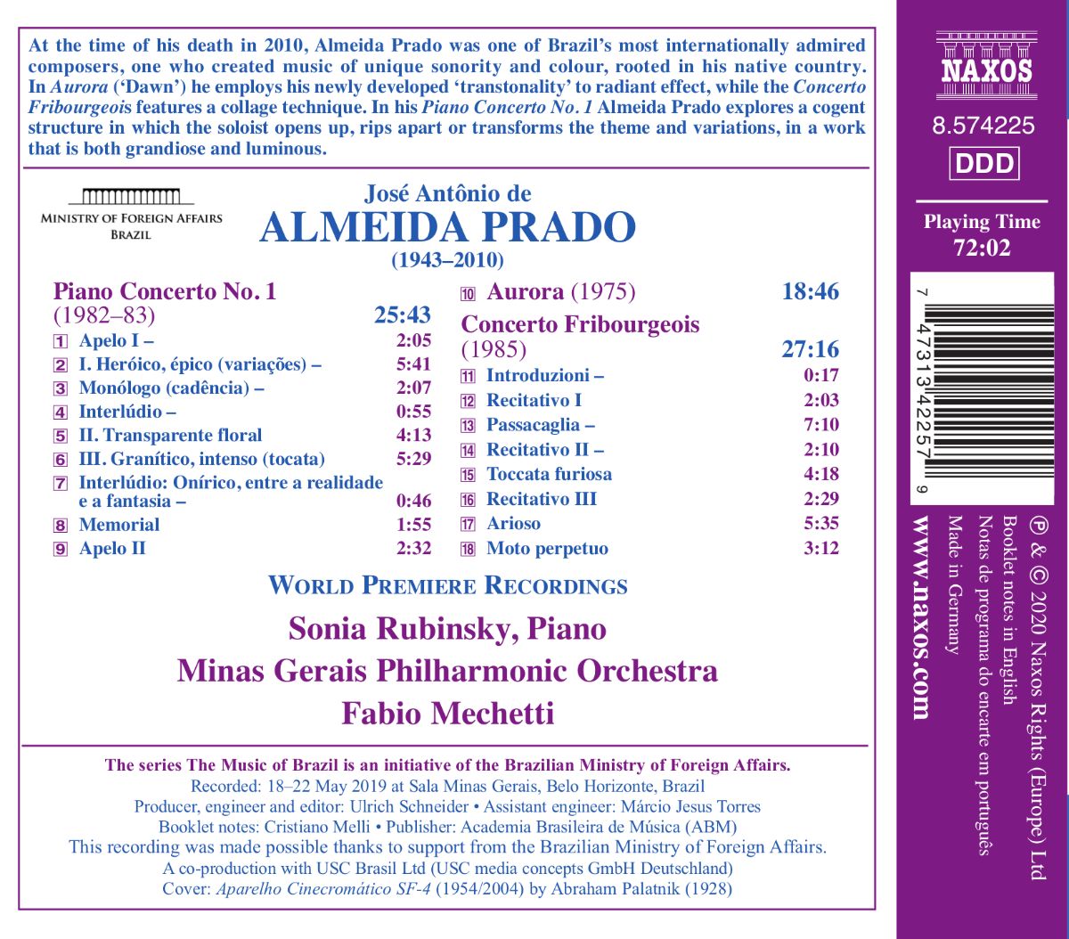 In „Aurora“ setzte er seine neu entwickelte Technik der „Transtonalität“ ein, während das „Concerto Fribourgeois“ in einer Collagetechnik daherkommt. In seinem Klavierkonzert Nr. 1 erforscht Almeida Prado eine in sich schlüssige Struktur, in der der Solist das Thema und die Variationen öffnet, auseinanderreißt oder transformiert. Ein Werk, das sowohl grandios als auch leuchtend ist.