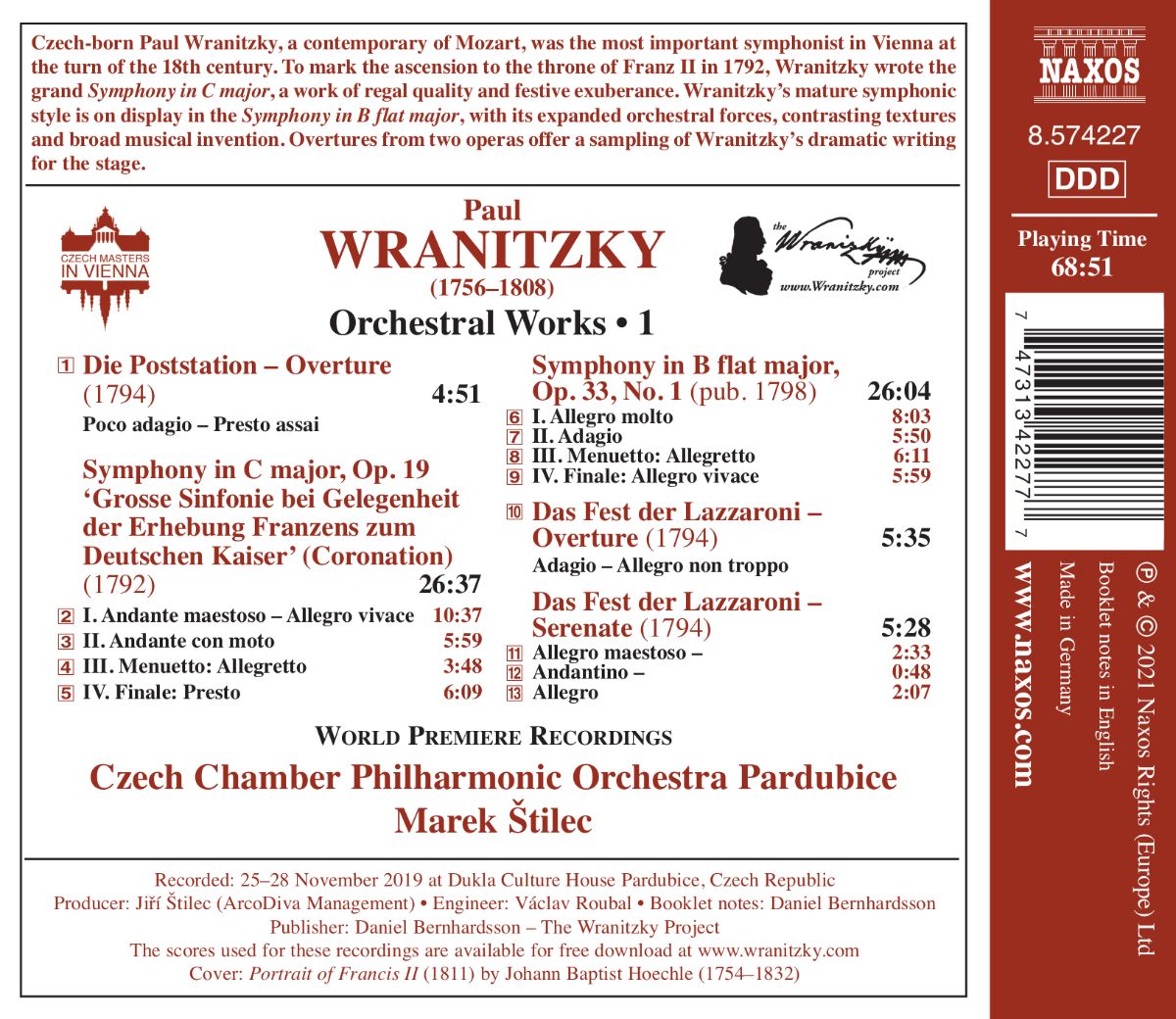Paul Wranitzky (1756–1808) avancierte nach dem Tode des (gleichaltrigen) Mozarts zu einer Schlüsselfigur der sinfonischen Musik in Wien, bevor Beethoven Anfang des 19. Jahrhunderts auf den Plan trat. Er schrieb seine „Grande Symphonie“ in C-Dur anlässlich der Thronbesteigung Franz II. Anfang der 1790er Jahre: ein Werk von königlicher Eleganz und festlicher Ausgelassenheit. Seine spätere Sinfonie in B-Dur op. 33/1 mit ihren erweiterten Orchesterkräften, kontrastierenden Texturen und weitreichenden musikalischen Neuerungen verweist schon auf die Entwicklungen, die sich bald durchsetzen sollten.