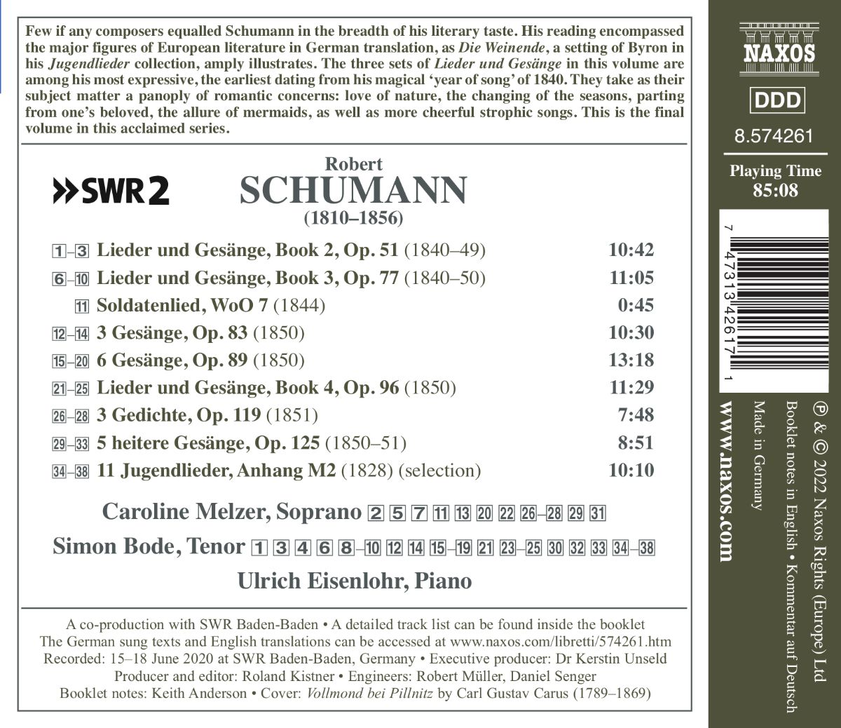 Die beiden Hefte (Nr. 2 und 3) der „Lieder und Gesänge“ opp. 51 & 77 von Robert Schumann gehören zu seinen ausdrucksstärksten Werken überhaupt. Die frühesten Lieder in diesen Sammlungen stammen aus seinem magischen „Liederjahr“ 1840. Sie thematisieren typisch romantische Themen, etwa die Liebe zur Natur, der Wechsel der Jahreszeiten, die Trennung von der Geliebten. Zehn Jahre später entstanden die „3 Gesänge“, op. 83 und „6 Gesänge“, op. 89. Es sind Werke voller Abschiedsschmerz und Resignation, in denen man das herannahende Unglück Schumanns erahnen kann.