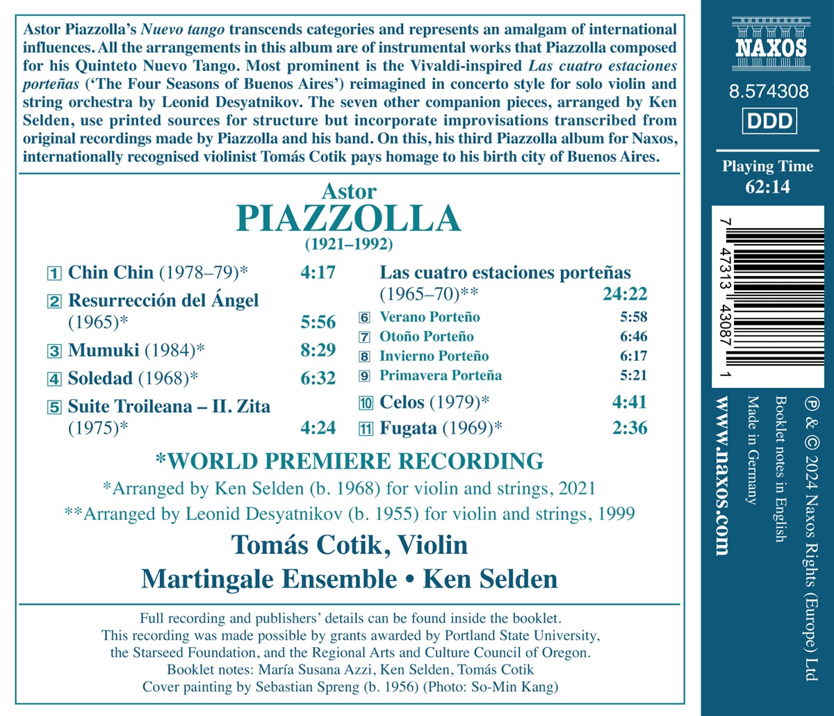 Astor Piazzollas „Tango Nuevo“ lässt sich nicht einfach in ein Genre einordnen und enthält eine Vielzahl von Einflüssen aus aller Herren Länder. Alle Arrangements auf diesem Album sind Instrumentalstücke, die Piazzolla für sein Quinteto Nuevo Tango komponierte. Am bekanntesten sind die von Vivaldi inspirierten „Cuatro estaciones porteñas“ (Die vier Jahreszeiten von Buenos Aires), die von Leonid Desyatnikov im Stil eines Konzerts für Solovioline und Streichorchester neu umgesetzt wurden. Als Solist ist der preisgekrönte Violinist Tomás Cotik zu hören.