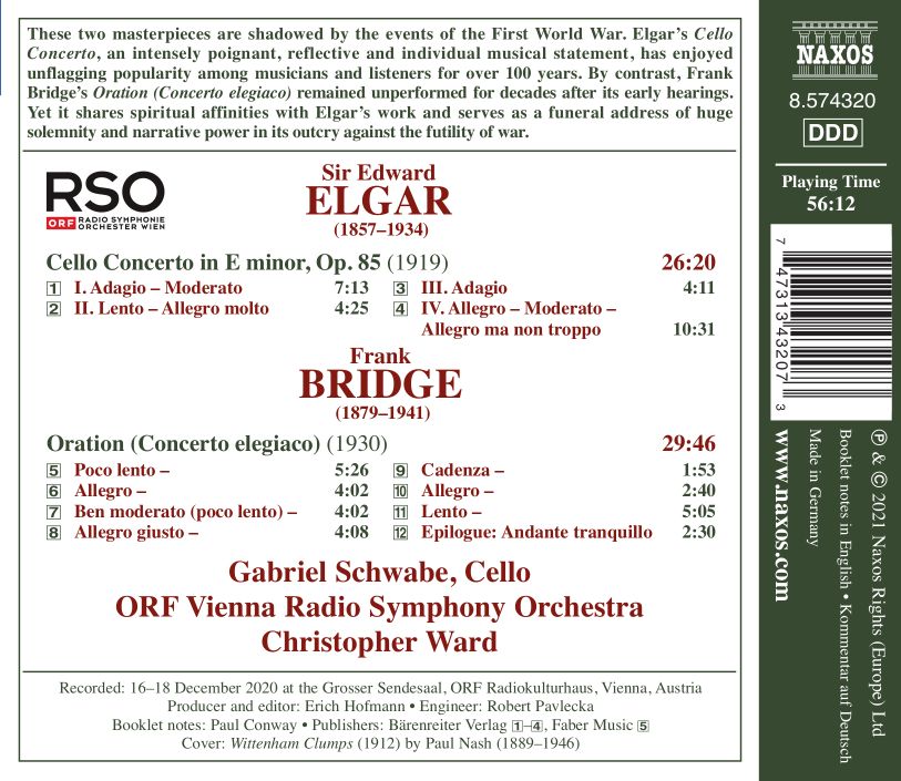 Elgars Cellokonzert, ein ergreifendes, nachdenkliches und zutiefst melancholisches Werk, erfreut sich (nach einigen Startschwierigkeiten) spätestens seit der legendären Einspielung von Jacqueline du Pré 1965 ungebrochener Beliebtheit. Im Gegensatz dazu blieb Frank Bridges nicht minder eindrucksvolles „Oration: Concerto elegiaco“ bald nach seiner Uraufführung 1930 jahrzehntelang unaufgeführt. Es weist eine geistige Verwandtschaft zu Elgars Werk auf und kann als Trauerrede von großer erzählerischer Kraft gegen die Sinnlosigkeit des Krieges gedeutet werden. Beide Konzerte passen hervorragend zu Gabriel Schwabes sanglichem, eloquenten Stil