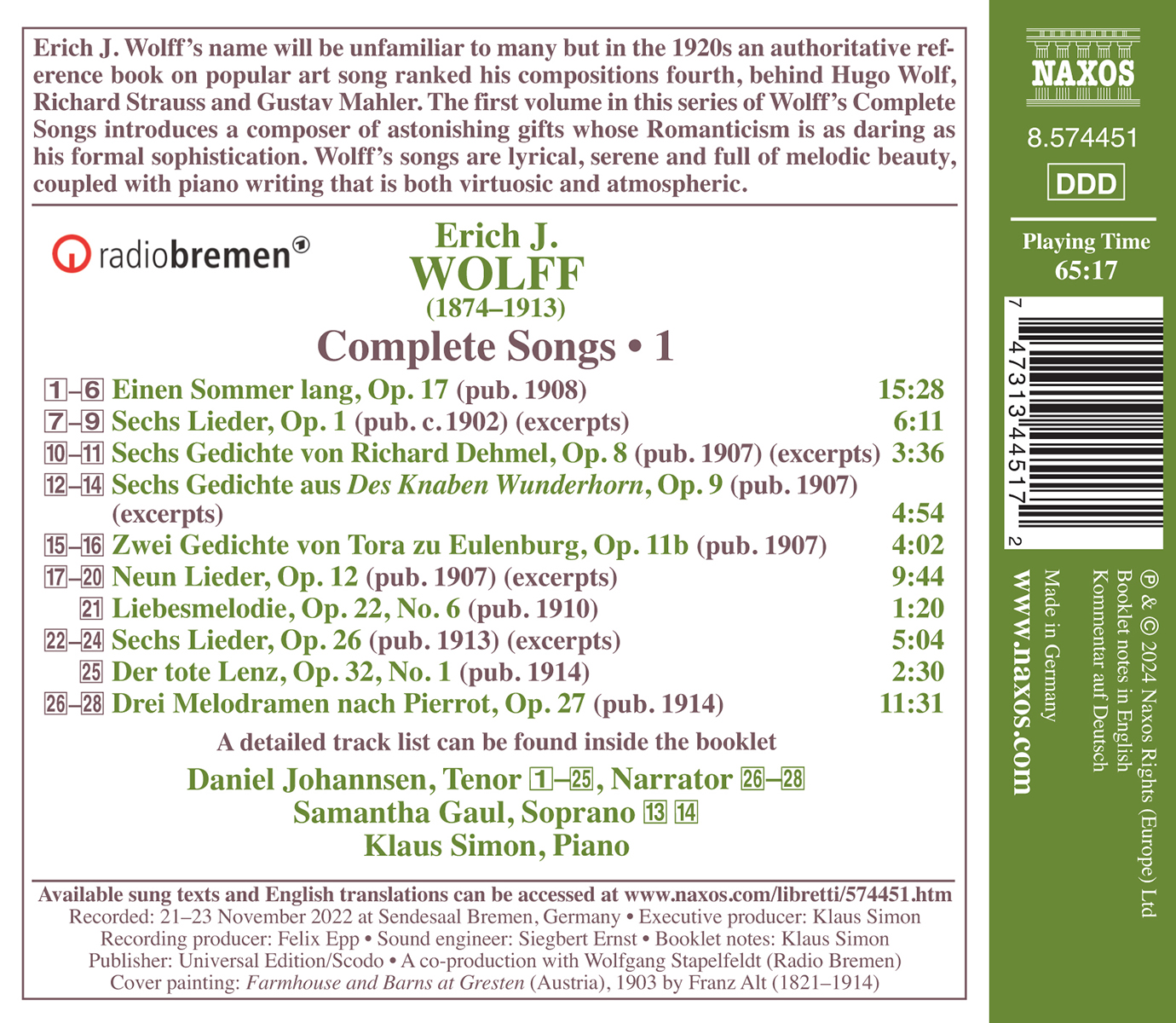 Erich J. Wolff ist heute nicht mehr jedem bekannt, aber Anfang des 20. Jahrhunderts gehörte er neben Hugo Wolf, Richard Strauss und Gustav Mahler zu den ganz großen Kunstlied-Komponisten. Dieser erste Teil einer Reihe mit seinen sämtlichen Liedern – es sind über 150 Stücke – präsentiert Werke, die lyrisch und von großer melodiöser Schönheit sind, begleitet von virtuoser und atmosphärischer Klaviermusik.