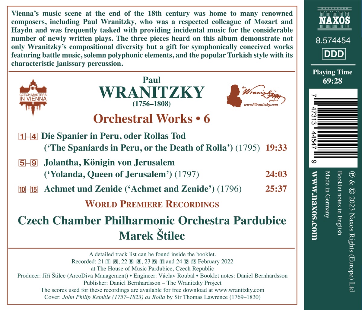 Ende des 18. Jahrhunderts lebten viele äußerst bekannte Komponisten in Wien, darunter Paul Wranitzky, ein hoch geschätzter Kollege von Mozart und Haydn. Ihm wurde oft die Aufgabe übertragen, Schauspielmusiken für neu geschriebene Theaterstücke zu komponieren. Die drei Werke auf diesem Album sind ein Beispiel nicht nur für Wranitzkys kompositorische Vielseitigkeit, sondern auch für sein Talent bildhafte Werke zu komponieren, die unter anderem auch polyphone Elemente oder den damals beliebten türkischen Stil mit der typischen perkussionslastigen Janitscharenmusik enthielt. Dirigent Marek Štilec ist ein Spezialist für tschechische romantische und zeitgenössische Musik und wurde für die bereits erschienenen fünf Volumina der Wranitzky-Reihe von der Presse hochgelobt.