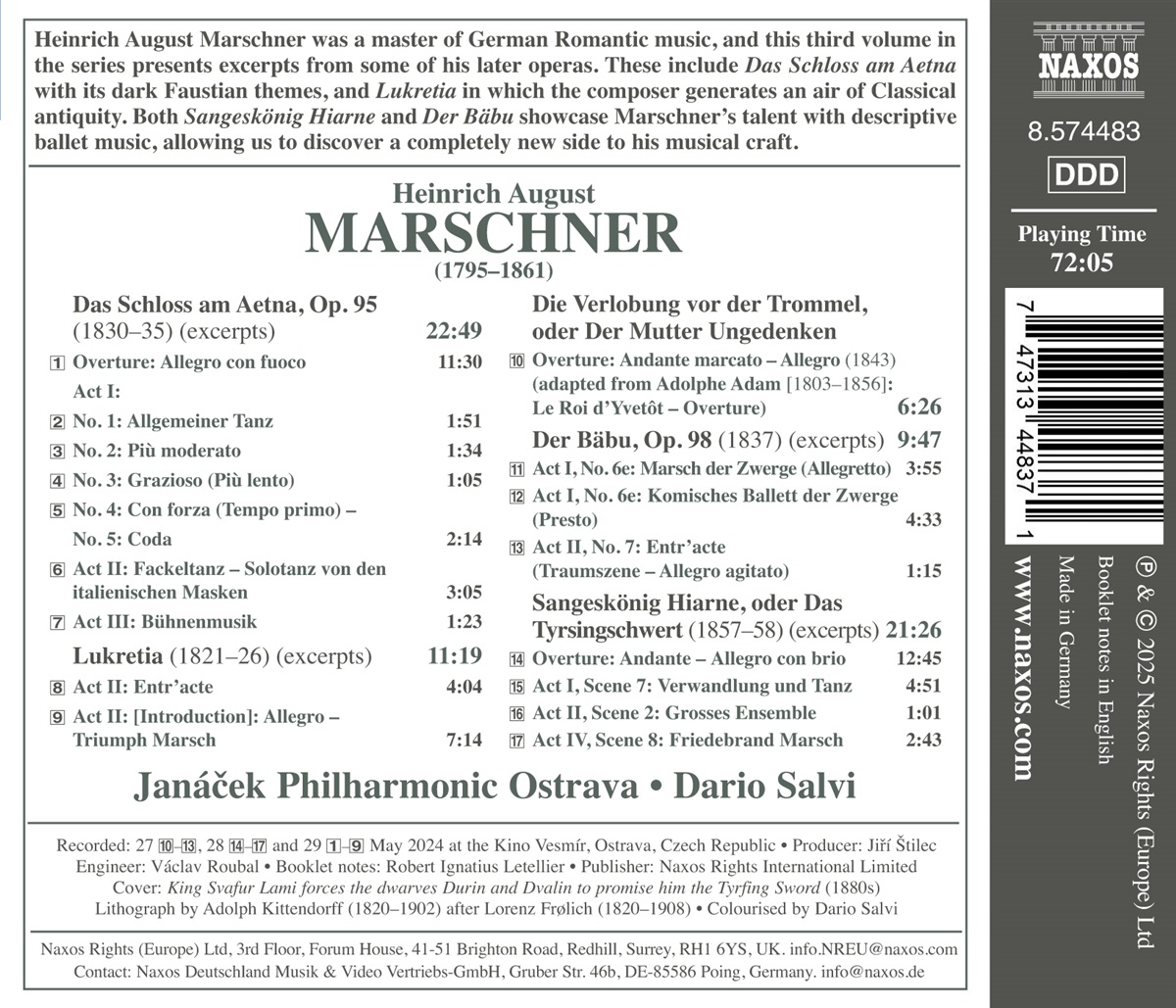 Heinrich August Marschner war ein Meister der deutschen romantischen Musik, und dieser dritte Band der Reihe präsentiert Auszüge aus einigen seiner späteren Opern. Dazu gehören „Das Schloss am Aetna“ mit seinen dunklen faustischen Themen und „Lukretia“, in der der Komponist einen Hauch von klassischer Antike erzeugt. Sowohl „Sangeskönig Hiarne“ als auch „Der Bäbu“ zeigen Marschners Talent für anschauliche Ballettmusik und lassen uns eine ganz neue Seite seines musikalischen Handwerks entdecken.