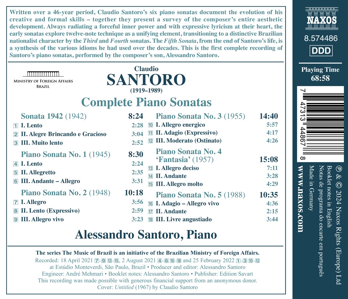 Claudio Santoros sechs Klaviersonaten, die über einen Zeitraum von 46 Jahren entstanden sind, dokumentieren die Entwicklung seiner kreativen und formalen Fähigkeiten – zusammen stellen sie eine Übersicht über die gesamte ästhetische Entwicklung des Komponisten dar. Die frühen Sonaten strahlen stets eine kraftvolle innere Stärke aus und sind im Kern von ausdrucksstarker Lyrik geprägt. Sie erforschen die Zwölftontechnik als verbindendes Element und gehen in der dritten und vierten Sonate in einen unverwechselbaren brasilianischen nationalistischen Charakter über. Die fünfte Sonate, die am Ende von Santoros Leben entstand, ist eine Synthese der verschiedenen Idiome, die er im Laufe der Jahrzehnte verwendet hatte.