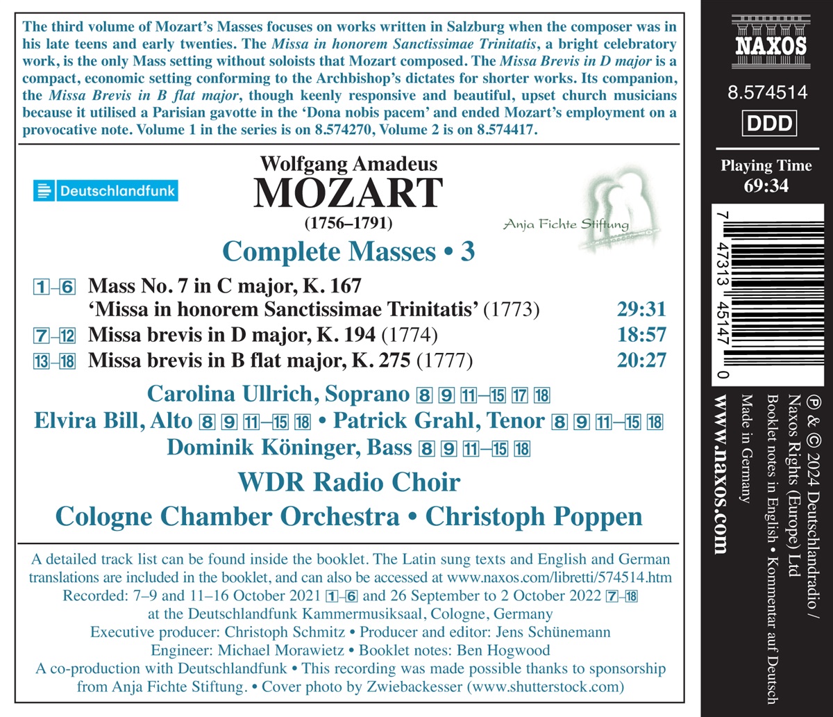 Der dritte Teil der Reihe mit sämtlichen Messen von Wolfgang Amadeus Mozart befasst sich mit Werken, die der Komponist in den Jahren um seinen 20. Geburtstag herum geschrieben hat. Die fröhliche „Missa in honorem Sanctissimae Trinitatis“ ist die einzige Messe ohne Solisten, die Mozart je komponierte. Die „Missa Brevis in D–Dur“ ist so kompakt wie der Erzbischof es damals vorsah. Die „Missa Brevis in B-Dur“ ist einfühlsam und schön, stellte aber das Ende von Mozarts Arbeit für den Bischof dar, da sie entgegen der Konvention eine Pariser Gavotte enthielt. Christoph Poppen leitet das Kölner Kammerorchester und den WDR Rundfunkchor, Solisten sind Carolina Ullrich, Elvira Bill, Patrick Grahl und Dominik Köninger.