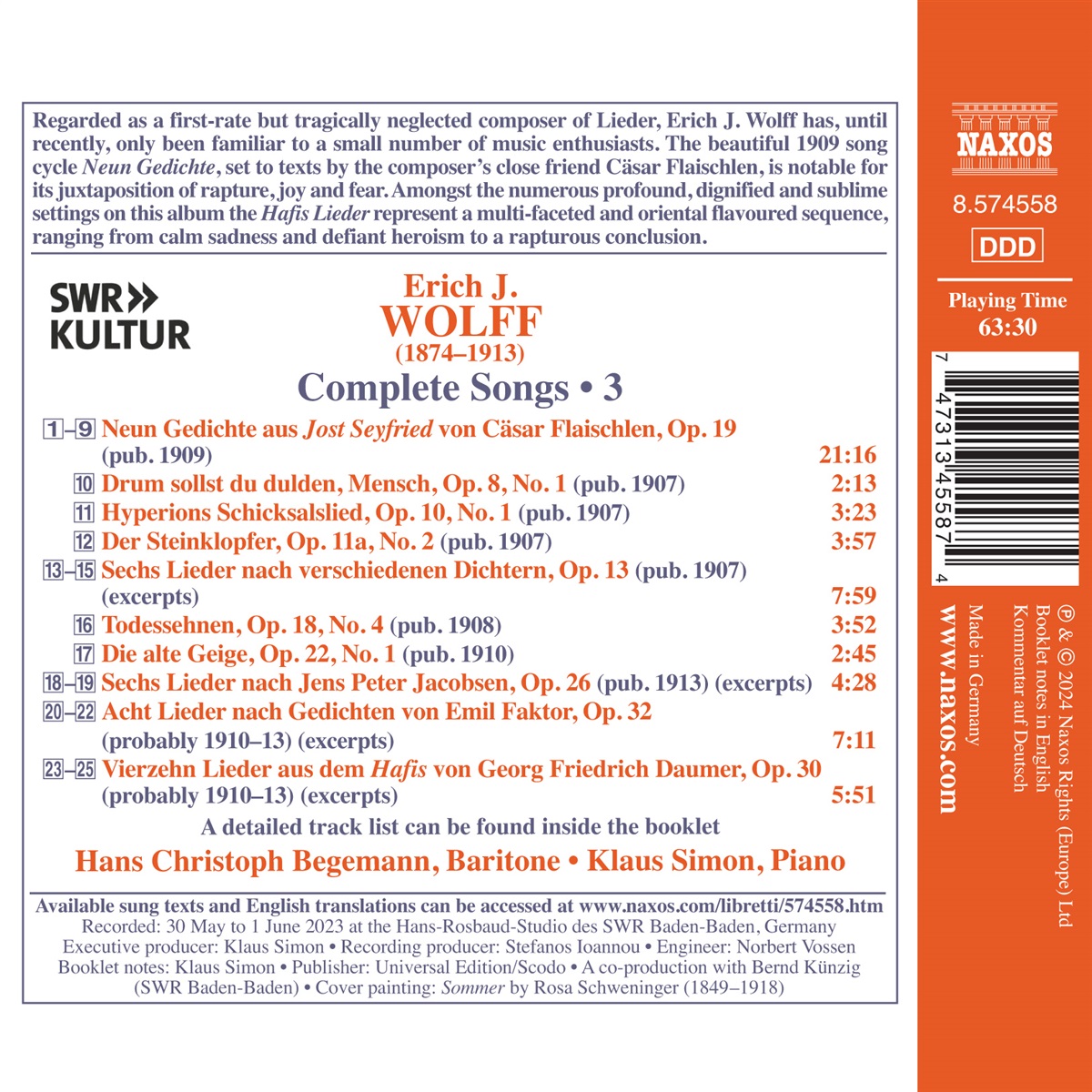 Erich J. Wolff, der als erstklassiger, aber tragisch vernachlässigter Liedkomponist gilt, war bis vor kurzem nur einer kleinen Zahl von Musikliebhabern bekannt. Der schöne Liederzyklus Neun Gedichte von 1909 auf Texte des engen Freundes Cäsar Flaischlen zeichnet sich durch das Nebeneinander von Schwärmerei, Freude und Angst aus. Unter den zahlreichen tiefgründigen, würdevollen und erhabenen Vertonungen auf diesem Album stellen die Hafis-Lieder eine facettenreiche und orientalisch angehauchte Abfolge dar, die von ruhiger Traurigkeit über trotzigen Heroismus bis hin zu einem schwärmerischen Schluss reicht.
