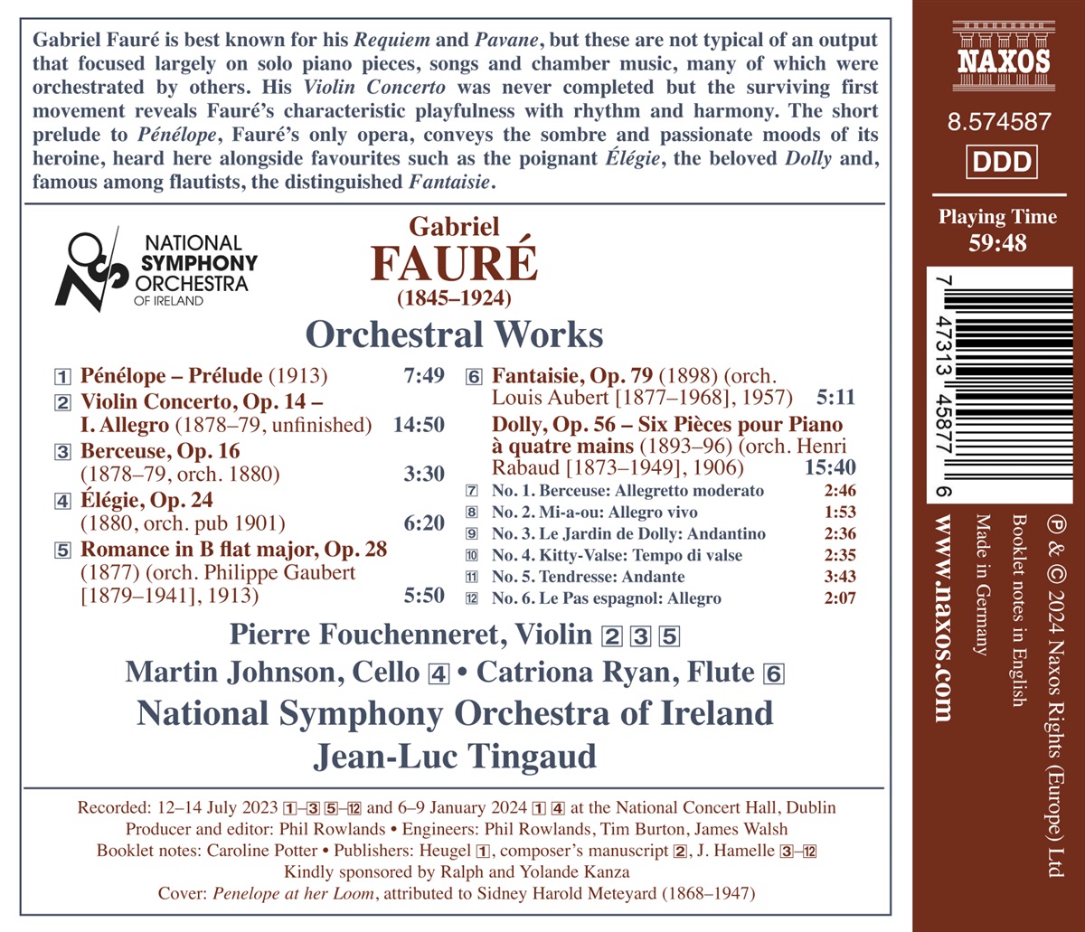 Gabriel Fauré ist vor allem für sein „Requiem“ und seine „Pavane“ bekannt, aber diese sind nicht typisch für ein Werk, das sich hauptsächlich auf Soloklavierstücke, Lieder und Kammermusik konzentrierte, von denen viele von anderen orchestriert wurden. Sein Violinkonzert wurde nie vollendet, aber der erhaltene erste Satz offenbart Faurés charakteristische Verspieltheit in Bezug auf Rhythmus und Harmonie. Das kurze Vorspiel zu „Pénélope“, Faurés einziger Oper, vermittelt die düsteren und leidenschaftlichen Stimmungen der Titelheldin, es ist hier neben beliebten Stücken wie der ergreifenden „Élégie“, dem beliebten „Dolly“ und der unter Flötisten berühmten „Fantaisie“ zu hören. Jean-Luc Tingaud dirigiert das National Symphony Orchestra of Ireland, Solist des Violinkonzerts ist Pierre Fouchenneret.
