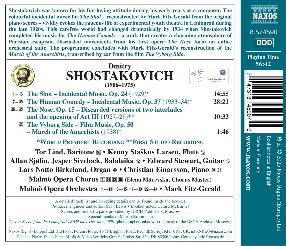 Diese Veröffentlichung knüpft an eine Reihe von Mark Fitz-Geralds Aufnahme mit Schostakowitschs Musik für Film und Theater an, darunter „The Bedbug“ und „The Girlfriends“. Mark Fitz-Gerald gilt als einer der unverzichtbaren Schostakowitsch-Interpreten unserer Zeit und feiert weltweit große Erfolge. Die neue Aufnahme entstand mit dem Malmö Opera Orchestra und Chor, allesamt erfahrene Musiker, die bereits zahlreiche Aufnahmen eingespielt haben. Fitz-Gerald führte mit großem Erfolg den Trauberg/Schostakowitsch-Klassiker „New Babylon“ (1929) auf, besonders hervorzuheben sind dabei die japanische Erstaufführung des Werks (Eröffnungskonzert des Tokyo Summer Festival 2000) und der Auftritt beim Rotterdam Gergiev Festival 2001. Mit Hilfe von Irina Schostakowitsch und Krzystof Meyer restaurierte er die vollständige Partitur zu einem weiteren Film von Trauberg/Schostakowitsch, „Odna“ (1929), und dirigierte die Weltpremiere (die erste Schostakowitsch-Premiere seit über zwanzig Jahren) in den Niederlanden und später in Paris mit großem Erfolg.