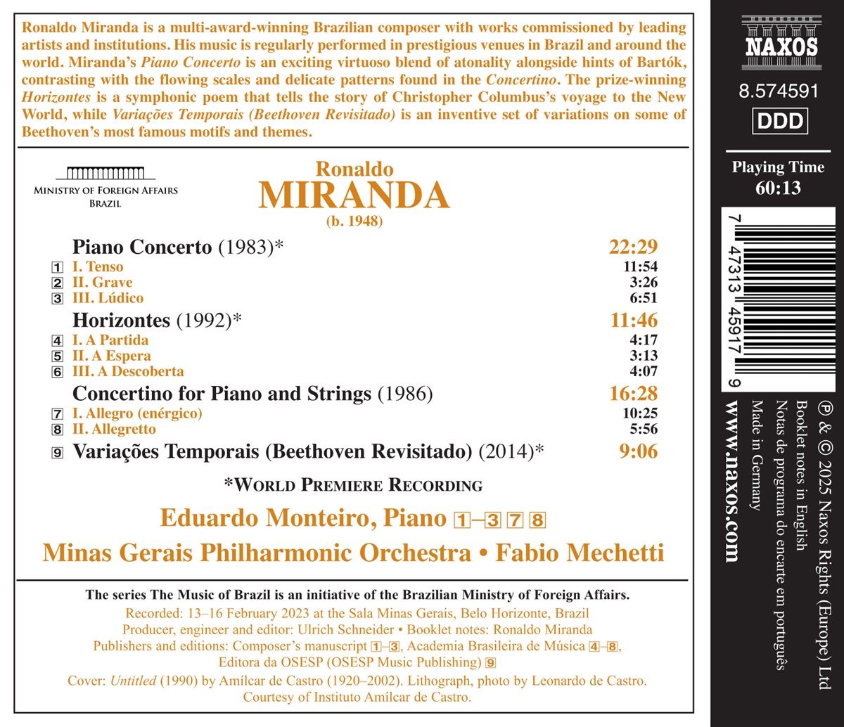 Ronaldo Miranda ist ein mehrfach ausgezeichneter brasilianischer Komponist, dessen Werke von führenden Künstlern und Institutionen in Auftrag gegeben wurden. Seine Musik wird regelmäßig an renommierten Veranstaltungsorten in Brasilien und auf der ganzen Welt aufgeführt. Mirandas Klavierkonzert ist eine virtuose Mischung aus Atonalität und Anklängen an Bartók, die im Kontrast zu den fließenden Skalen und zarten Mustern des Concertino steht. Das preisgekrönte „Horizontes“ ist eine symphonische Dichtung, die die Geschichte von Christoph Kolumbus' Reise in die Neue Welt erzählt, während „Variações Temporais“ („Beethoven Revisitado“) eine einfallsreiche Reihe von Variationen über einige der berühmtesten Motive und Themen von Ludwig van Beethoven ist. Eduardo Monteiro gilt als einer der größten Pianisten der brasilianischen Szene und erlangte internationale Anerkennung, nachdem er 1989 beim Internationalen Klavierwettbewerb in Köln den ersten Preis und den Sonderpreis der Jury für die beste Beethoven-Interpretation gewonnen hatte. Fabio Mechetti ist seit der Gründung des Orchesters dessen künstlerischer Leiter und Chefdirigent. Unter seiner Leitung hat das Orchester zahlreiche Auszeichnungen erhalten, neun Alben aufgenommen und eine Tournee durch Südamerika unternommen. Er ist Chefdirigent des Malaysian Philharmonic Orchestra und leitete 14 Jahre lang das Jacksonville Symphony Orchestra, dessen Ehrendirigent er heute ist.