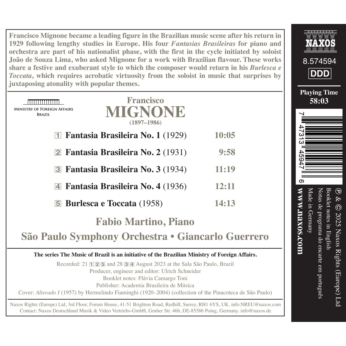 Francisco Mignone wurde nach seiner Rückkehr aus Europa im Jahr 1929, wo er lange studiert hatte, zu einer führenden Persönlichkeit der brasilianischen Musikszene. Seine vier „Fantasias Brasileiras für Klavier und Orchester” stammen aus seiner nationalistischen Phase. Die erste des Zyklus entstand auf Wunsch des Solisten João de Souza Lima, der Mignone um ein Werk mit brasilianischem Flair gebeten hatte. Diese Werke zeichnen sich durch einen festlichen und überschwänglichen Stil aus, zu dem der Komponist in seiner „Burlesca e Toccata” zurückkehrte, die dem Solisten akrobatische Virtuosität abverlangt und durch die Gegenüberstellung von Atonalität und populären Themen überrascht. Giancarlo Guerrero ist ein häufiger Gastdirigent in Nordamerika und trat unter anderem mit dem New York Philharmonic, dem Chicago Symphony Orchestra, dem National Symphony Orchestra, dem San Francisco Symphony Orchestra sowie den Orchestern von Boston, Los Angeles, Philadelphia und Seattle auf. International hat er Orchester in ganz Europa, Neuseeland und Australien dirigiert. Als Musikdirektor der Nashville Symphony veröffentlichte er mit dem Orchester 21 kommerzielle Aufnahmen und erhielt 13 Grammy-Nominierungen und 6 Grammy Awards. Diese Veröffentlichung folgt auf die Aufnahme von Mignones vollständigen Violinsonaten und seinen Konzerten und Concertinos, die von der Presse hoch gelobt wurden.