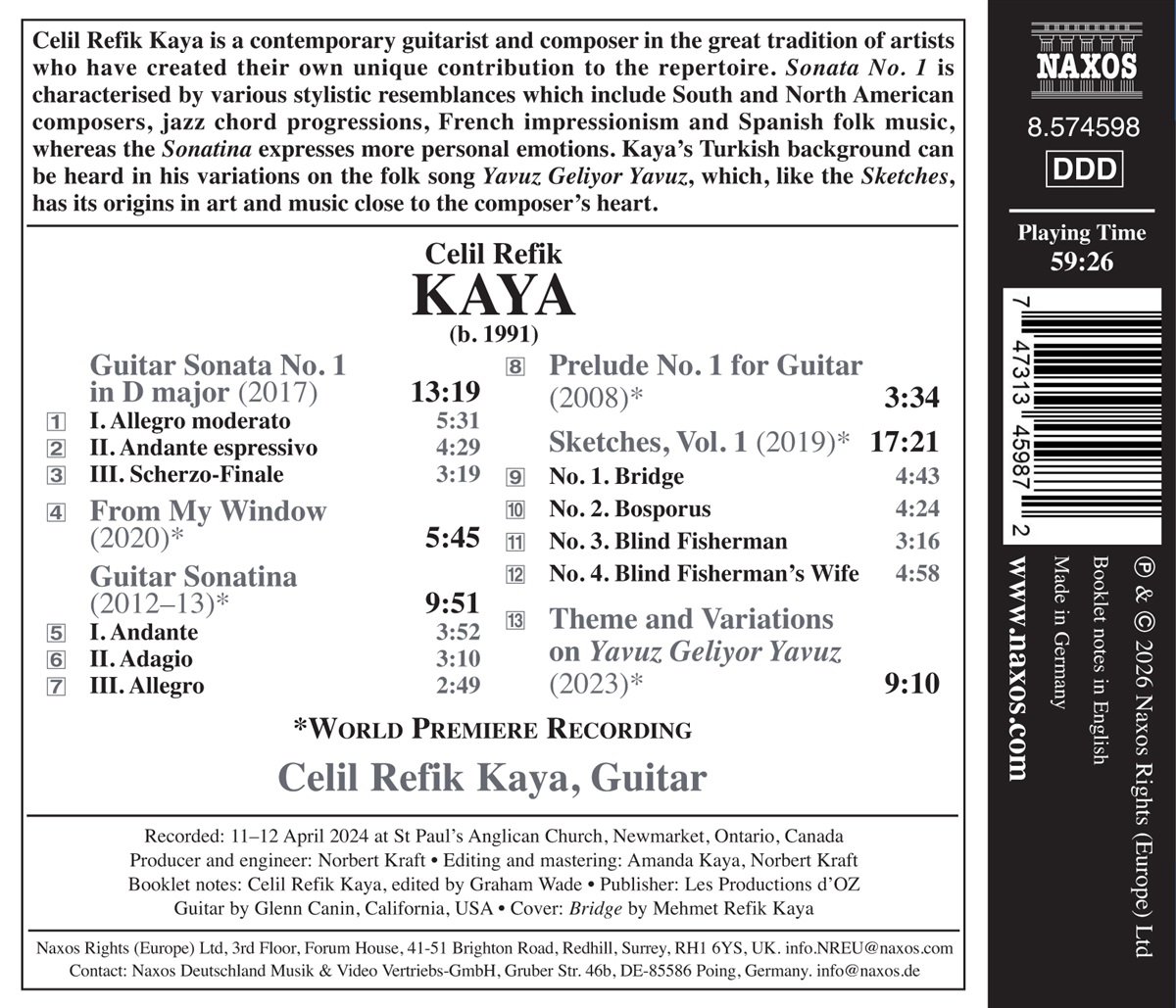 Celil Refik Kaya ist ein zeitgenössischer Gitarrist und Komponist in der großen Tradition von Künstlern, die selbst das Repertoire für ihr Instrument erweitert haben. Die „Sonate Nr. 1“ weist Ähnlichkeiten zu ganz unterschiedlichen Stilen auf, darunter süd- und nordamerikanische Komponisten, Jazz-Akkordfolgen, französischer Impressionismus und spanische Volksmusik, während die „Sonatine“ eher persönliche Emotionen zum Ausdruck bringt. Kayas türkischer Hintergrund ist in seinen Variationen des Volksliedes „Yavuz Geliyor Yavuz“ zu hören, das wie die „Sketches“ seinen Ursprung in der Kunst und Musik hat, die dem Komponisten am Herzen liegen. Celil Refik Kayas neue Aufnahme seiner eigenen Gitarrenmusik reiht sich ein in die gefeierten Veröffentlichungen von Werken anderer Komponisten. Kayas erste Aufnahme, „Jorge Morel: Guitar Music”, wurde im American Record Guide als ‚einfach perfekt‘ bewertet, und MusicWeb International fügte hinzu, dass ‚das Spiel in jeder Hinsicht großartig ist und von einem der herausragenden jungen Virtuosen der Gitarre stammt‘. Kaya hat auch Werken von Carlo Domeniconi und Agustín Barrios Mangoré eingespielt.