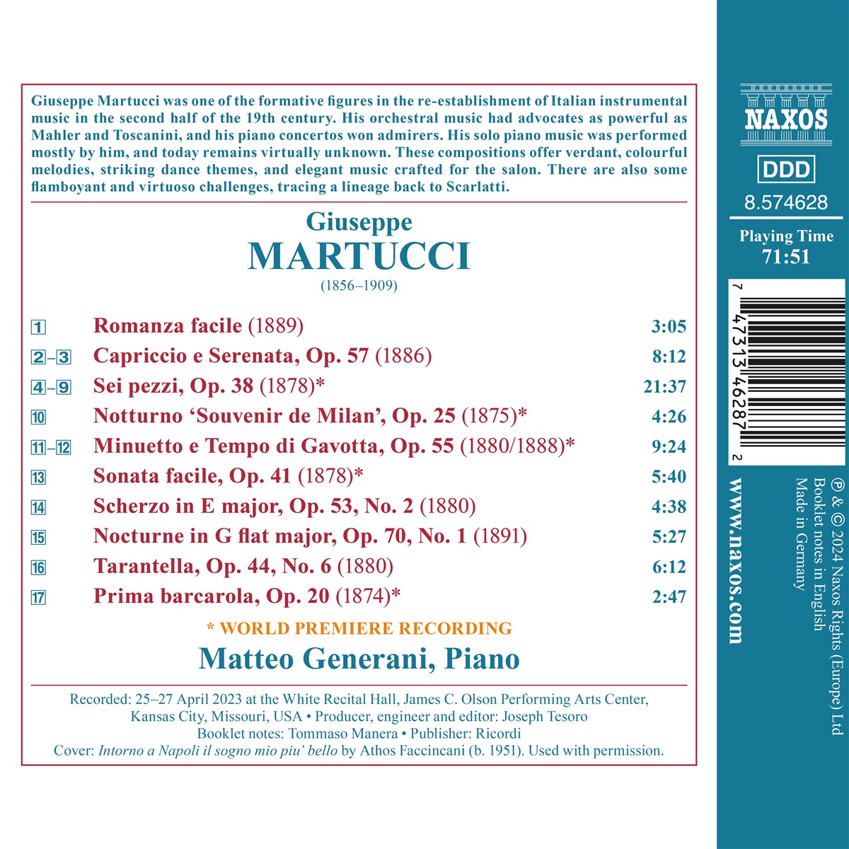 Giuseppe Martucci war eine der prägenden Figuren bei der Wiederbelebung der italienischen Instrumentalmusik in der zweiten Hälfte des 19. Jahrhunderts. Seine Orchestermusik hatte so einflussreiche Fürsprecher wie Gustav Mahler und Arturo Toscanini, und seine Klavierkonzerte fanden Bewunderer. Seine Solo-Klaviermusik wurde hauptsächlich von ihm selbst aufgeführt und ist heute praktisch unbekannt. Diese Kompositionen bieten frische, farbenfrohe Melodien, eindrucksvolle Tanzthemen und elegante Musik, die für den Salon geschaffen wurde. Es gibt auch einige extravagante und virtuose Herausforderungen, die auf Scarlatti zurückgehen. Der Pianist Matteo Generani ist Gewinner nationaler und internationaler Wettbewerbe, darunter der Solo-Klavierwettbewerb Villa Oliva (Italien, 2018) und die White Lake Young Artist Solo Performance (Montague, Michigan, 2019).