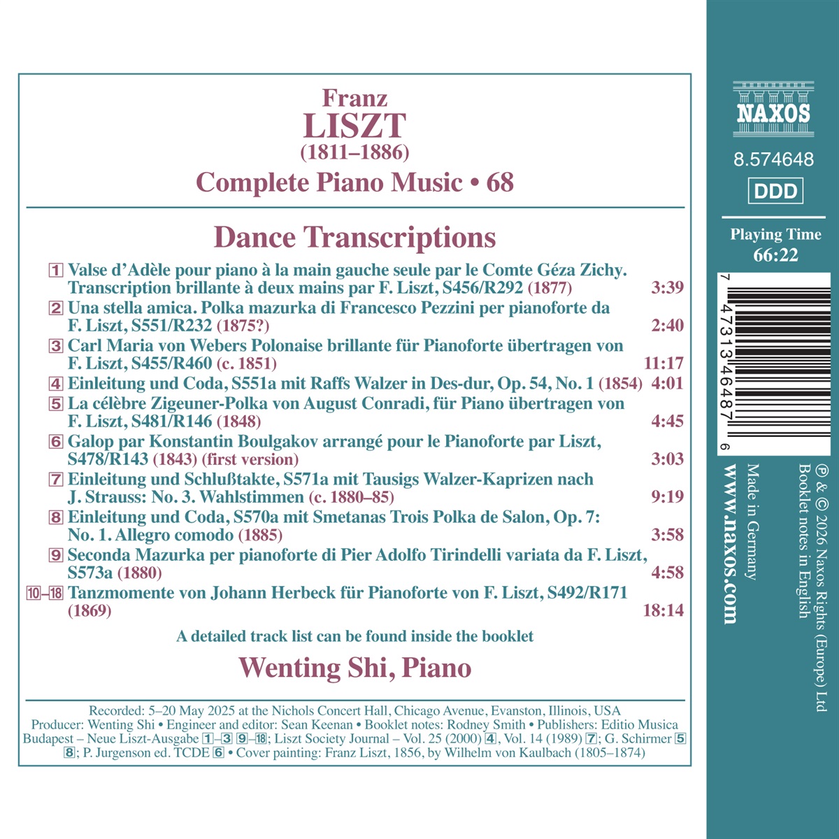 Franz Liszts Freundes- und Musikerkreis war groß und vielfältig. Großzügig wie er war, förderte er ihre Musik oft durch Transkriptionen, Bearbeitungen und Ergänzungen. Diese Sammlung enthält unter anderem Bearbeitungen von Tanzmusik-Werken berühmter Zeitgenossen wie Carl Maria von Weber und Bedřich Smetana, Ergänzungen zu einem Werk von Liszts Weimarer Assistenten Joachim Raff und eine Solotranskription der „Tanzmomente“ des einflussreichen Wiener Komponisten und Dirigenten Johann von Herbeck. Die Steinway-Künstlerin Wenting Shi hat in ihrer Karriere zahlreiche Auszeichnungen erhalten, darunter im April 2023 den ersten Preis des Luminarts Cultural Foundation Fellowship Award in den USA, der ihr den Titel Fellow Artist einbrachte. Sie erwarb mehrere Studienabschlüsse an Musikhochschulen in Yale, Wien und Berlin und promovierte schließlich. Sie gab Solokonzerte in renommierten internationalen Musikzentren wie der Alice Tully Hall in New York und der Hong Kong City Hall.