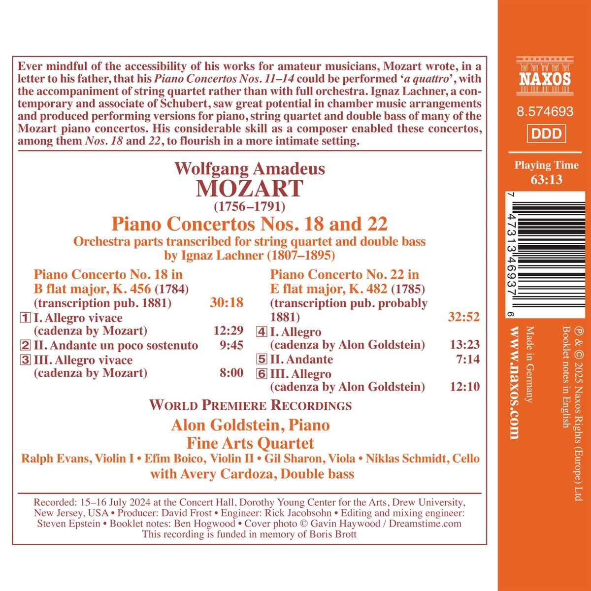 Wolfgang Amadeus Mozart, der stets darauf bedacht war, dass seine Werke auch für Amateurmusiker zugänglich waren, schrieb in einem Brief an seinen Vater, dass seine Klavierkonzerte Nr. 11–14 ‚a quattro‘ aufgeführt werden könnten, also mit Streichquartettbegleitung statt mit großem Orchester. Ignaz Lachner, ein Zeitgenosse und Weggefährte von Franz Schubert, sah großes Potenzial in Kammermusikarrangements und produzierte Aufführungsversionen für Klavier, Streichquartett und Kontrabass von vielen Mozart-Klavierkonzerten. Seine beachtlichen Fähigkeiten als Komponist ermöglichten es diesen Konzerten, darunter die Nr. 18 und 22, in einem intimeren Rahmen zu gedeihen. Das amerikanische Kammermusikensemble Fine Arts Quartet wurde 1946 gegründet und blickt auf eine lange Karriere als Aufnahmekünstler zurück. Es wurde für viele seiner jüngeren Aufnahmen gelobt, darunter Felix Mendelssohns Streichquintette und Alexander Glasunows Kammermusik, die von MusicWeb International zu den Aufnahmen des Jahres gekürt wurden, sowie Robert Schumanns Streichquartette, die vom American Record Guide als ‚eine der besten Kammermusikaufnahmen des Jahres‘ gefeiert wurden. Auch der Pianist Alon Goldstein ist ein gefeierter Künstler, der mit vielen großen Orchestern und Dirigenten wie Zubin Mehta, Herbert Blomstedt, Vladimir Jurowski, Rafael Frübeck de Burgos, Peter Oundjian, Yoel Levi, Yoav Talmi und Leon Fleisher zusammengearbeitet hat.