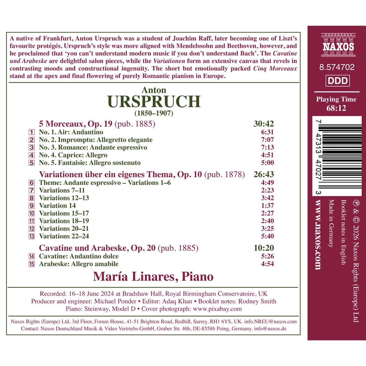 Der aus Frankfurt am Main stammende Anton Urspruch war Schüler von Joachim Raff und wurde später einer der Lieblingsschützlinge Franz Liszts. Urspruchs Stil war jedoch eher mit Felix Mendelssohn und Ludwig van Beethoven vergleichbar, und er verkündete, dass ‚man moderne Musik nicht verstehen kann, wenn man Bach nicht versteht‘. Die „Cavatine und Arabeske“ sind reizvolle Salonstücke, während die „Variationen“ ein umfangreiches Werk bilden, das sich durch kontrastreiche Stimmungen und konstruktive Genialität auszeichnet. Die kurzen, aber emotional dichten „Cinq Morceaux“ stehen an der Spitze und bilden die letzte Blüte des rein romantischen Klavierspiels in Europa. Die Reihe „Romantic Piano“ wurde im September 2025 mit Werken von Julius Benedict gestartet. Mit zahlreichen Weltpremierenaufnahmen erkundet und fördert diese Reihe wenig bekannte Komponisten und ungewöhnliches Repertoire. Weitere Teile präsentieren selten zu hörende Musik von Charles Gounod, Werke von Friedrich Kiel und Klaviersonaten von Wilhelm Taubert und Józef Wieniawski. Die Pianistin María Linares ist in ganz Europa aufgetreten und hat als Solistin mit zahlreichen Orchestern zusammengearbeitet. Sie wurde von der Lang Lang International Music Foundation zur Musikbotschafterin für Spanien ernannt. Neben ihrer aufstrebenden Konzertkarriere belegt sie derzeit als Stipendiatin einen Diplomstudiengang bei Norma Fisher und Danny Driver am Royal College of Music.