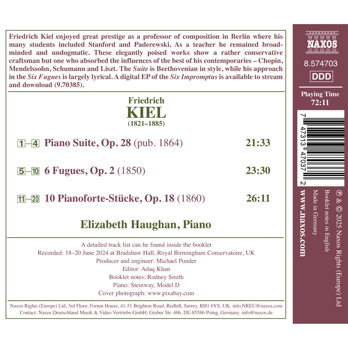 Friedrich Kiel genoss großes Ansehen als Professor für Komposition in Berlin, wo zu seinen zahlreichen Schülern Charles Villiers Stanford und Ignacy Jan Paderewski gehörten. Als Lehrer blieb er aufgeschlossen und undogmatisch. Die elegant komponierten Werke auf diesem Album zeigen einen eher konservativen Handwerker, der jedoch die Einflüsse der besten seiner Zeitgenossen – Frédéric Chopin, Felix Mendelssohn, Robert Schumann und Franz Liszt – in sich aufnahm. Die „Suite“ ist im Stil Beethovens gehalten, während sein Ansatz in den „Sechs Fugen“ weitgehend lyrisch ist. Eine digitale EP der „Sechs Impromptus“ steht zum Streamen und Herunterladen zur Verfügung. Elizabeth Haughan hat als Solistin und in Zusammenarbeit mit vielen Sängern und Instrumentalisten an Veranstaltungsorten wie dem Southbank Centre, der Wigmore Hall, der Birmingham Symphony Hall und dem Victoria and Albert Museum gearbeitet. Zu den jüngsten Höhepunkten zählen ihre Teilnahme als junge Künstlerin beim Leeds Lieder Festival und der Gewinn des Kathleen Ferrier Bursary-Begleitpreises. Sie wurde mit dem Leamington-Preis, dem Sylvia Cleaver Chamber-Preis sowie den Preisen für Instrumentalbegleitung aller großen Gesangswettbewerbe ausgezeichnet.