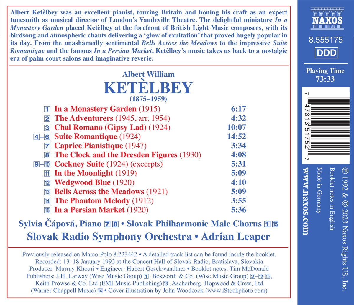 Albert Ketèlbey war ein ausgezeichneter Pianist, der durch ganz Großbritannien tourte und als Musikdirektor des Londonerner Vaudeville-Theaters seine musikalische Kunstfertigkeit weiter verbesserte. Die entzückende Miniatur „In a Monastery Garden“ machte Ketèlbey zu einem der bekanntesten Komponisten der britischen gehobenen Unterhaltungsmusik (der sogenannten „British Light Music“). Das sentimentale „Bells Across the Meadows“, die beeindruckende „Suite Romantique“ und das berühmte „In a Persian Market“ – all diese Ketèlbey-Stücke unternehmen mit uns eine nostalgische Reise in die phantasievolle Zeit der palmengeschmückten Tee-Salons.
