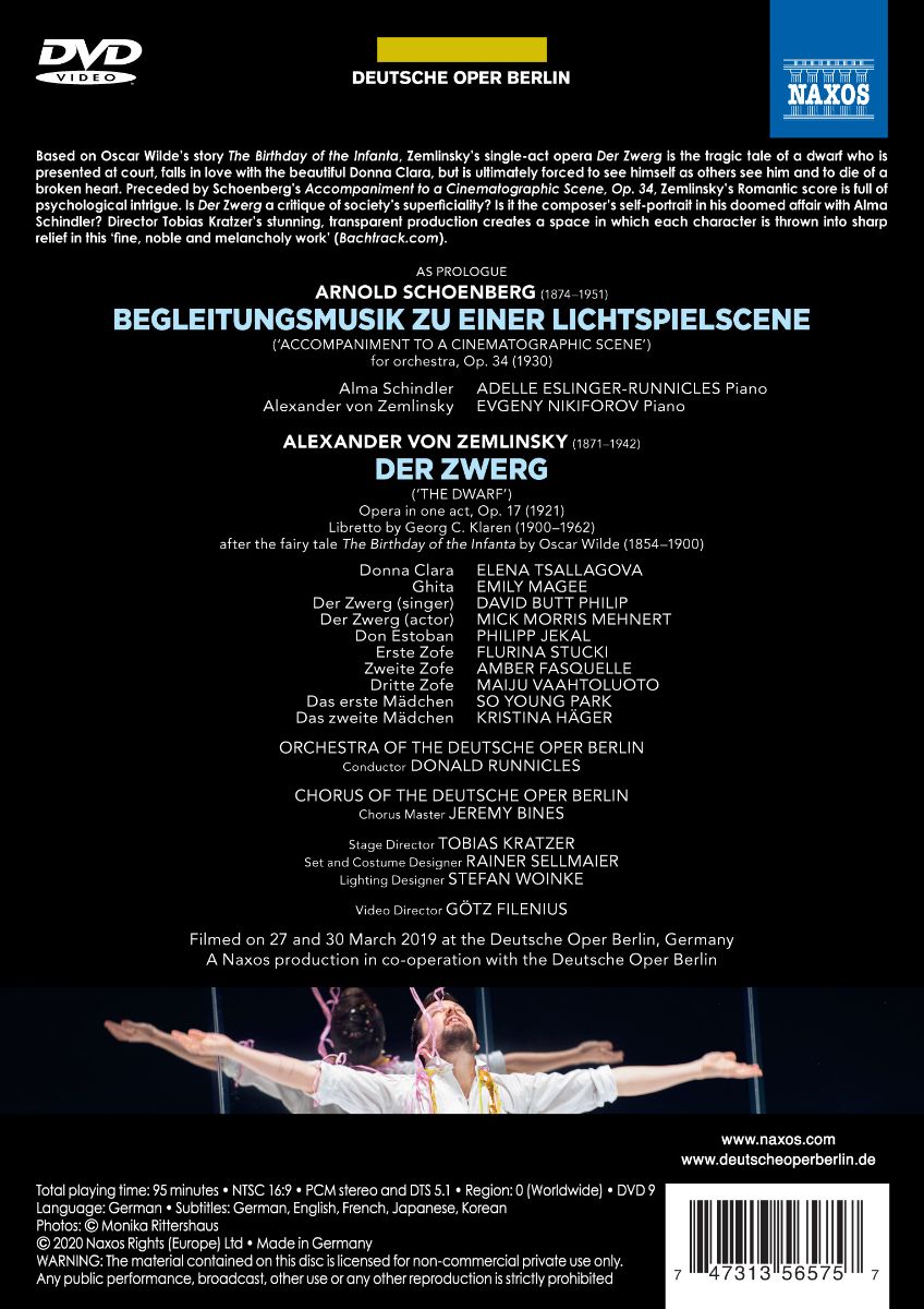 Nach dem großen Erfolg von Korngolds „Das Wunder der Heliane“ folgt nun die nächste hervorragende Produktion aus der Deutschen Oper Berlin. Zemlinskys Einakter „Der Zwerg“ ist ein veritables Psychodrama nach Oscar Wildes Stück „Der Geburtstag der Infantin“. Es geht um Liebe, soziale Verachtung und tragisches Schicksal eines von der Gesellschaft ausgeschlossenen. Der spannenden, spätromantischen und mitreißenden Oper vorangestellt wurde – quasi als musikalische Einstimmung – Arnold Schönbergs „Begleitungsmusik zu einer Lichtspielscene“ für zwei Klaviere und Orchester.