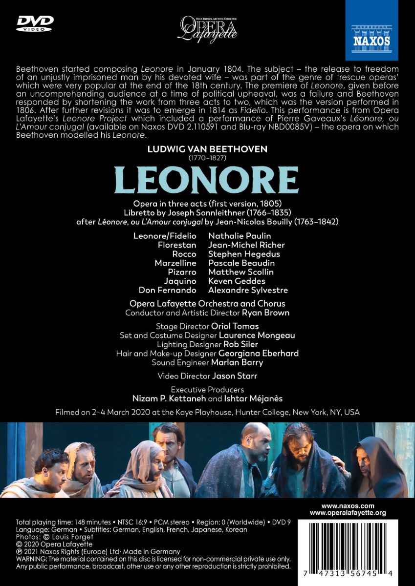 Beethoven begann mit der Komposition seiner „Leonore“ im Januar 1804. Das Thema – die Freilassung eines zu Unrecht inhaftierten Mannes in die Freiheit durch seine hingebungsvolle Ehefrau – gehörte zur Gattung der „Rettungsopern“, die Ende des 18. Jahrhunderts sehr populär waren. Die Uraufführung der Oper am 20. November 1805, die vor einem wenig verständnisvollen Publikum in einer Zeit politischer Umwälzungen gegeben wurde, war ein glatter Misserfolg. Beethoven reagierte darauf und schrieb die Oper mehrfach um. 1806 wurde eine leicht gekürzte „Leonore“ aufgeführt aber auch diese blieb relativ glücklos. Nach weiteren Überarbeitungen, kristallisierte sich 1814 die heute bekannte Fassung des „Fidelio“ heraus. Diese Aufführung der ursprünglichen Fassung von 1805 stammt aus dem Leonore-Projekt der Opera Lafayette, das mit einer Aufführung von Pierre Gaveaux' „Léonore“ begann, also jener Oper, nach der Beethoven seine Leonore modellierte. Die Kulissen und ein Großteil der Sänger aus der ersten Produktion kamen hier wieder zum Einsatz, um die Verbindung zwischen den beiden Werken zu verdeutlichen.