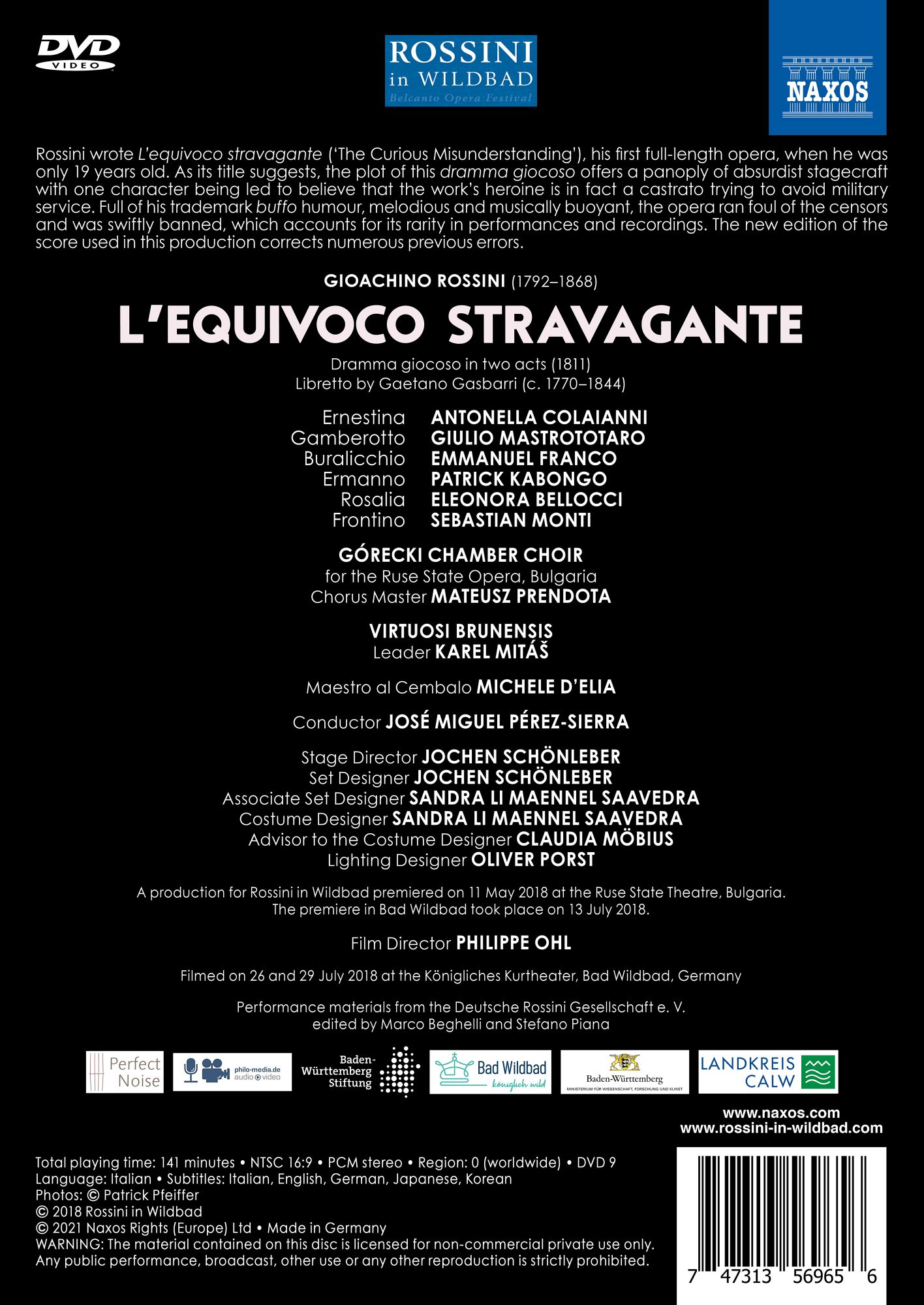 Gioachino Rossini schrieb seine erste abendfüllende Oper „L'equivoco stravagante“ (wörtlich ‚Das außergewöhnliche Missverständnis‘) als er gerade einmal 19 Jahre alt war. Wie der Titel schon andeutet, bietet die Handlung des Dramma giocoso eine Fülle von absurden Szenen. Die Oper, bereits voll von Rossinis typischen Buffo-Humor, melodiös und musikalisch beschwingt, fiel bei der Zensur durch und wurde schnell verboten, weshalb sie nur selten aufgeführt und aufgenommen wird. Die Neuausgabe der Partitur, die in dieser Produktion aus Bad Wildbad verwendet wurde, korrigiert zahlreiche frühere Fehler.