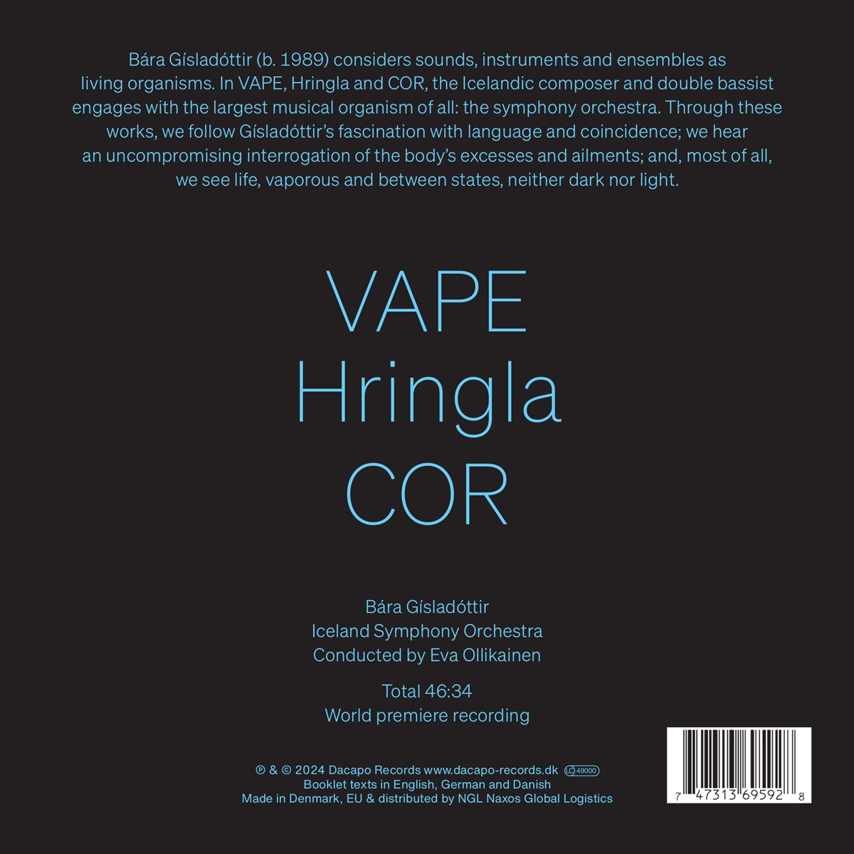 Die Komponistin Bára Gísladóttir betrachtet Klänge, Instrumente und Ensembles als lebendige Organismen. In den drei auf diesem Album vertretenen Stücken beschäftigt sich die Isländerin mit dem größten musikalischen Organismus von allen, dem Sinfonieorchester. Wie bei vielen ihrer Werke ist auch hier die beim ersten Hören düster klingende Musik mit Ironie und schwarzem Humor durchsetzt. Inspiration gewinnt die Komponistin und Kontrabassistin sowohl aus den Werken von Penderecki oder Scelsi als auch aus der Death-Metal- oder Techno-Musik.
