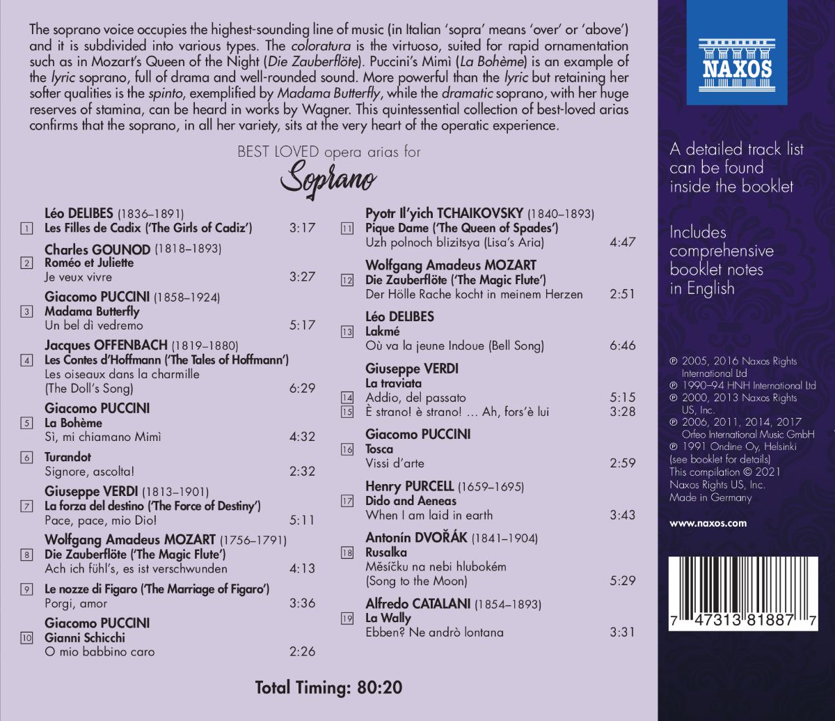 Jedes Album der Best-Loved-Reihe dient mit populären musikalischen Beispielen als Einführung in ein bestimmtes Instrument oder Stimmlage. Im umfangreichen Booklet ist eine verständliche Definition sowie Beschreibungen der ausgewählten Stücke enthalten. „Spectacular Soprano“ fasst berühmte Sopran-Arien von Purcell, Mozart, Puccini, Verdi u. a. zusammen und deckt die gesamte Bandbreite der Stimmlage, von Koloratur bis zum Verismo ab.