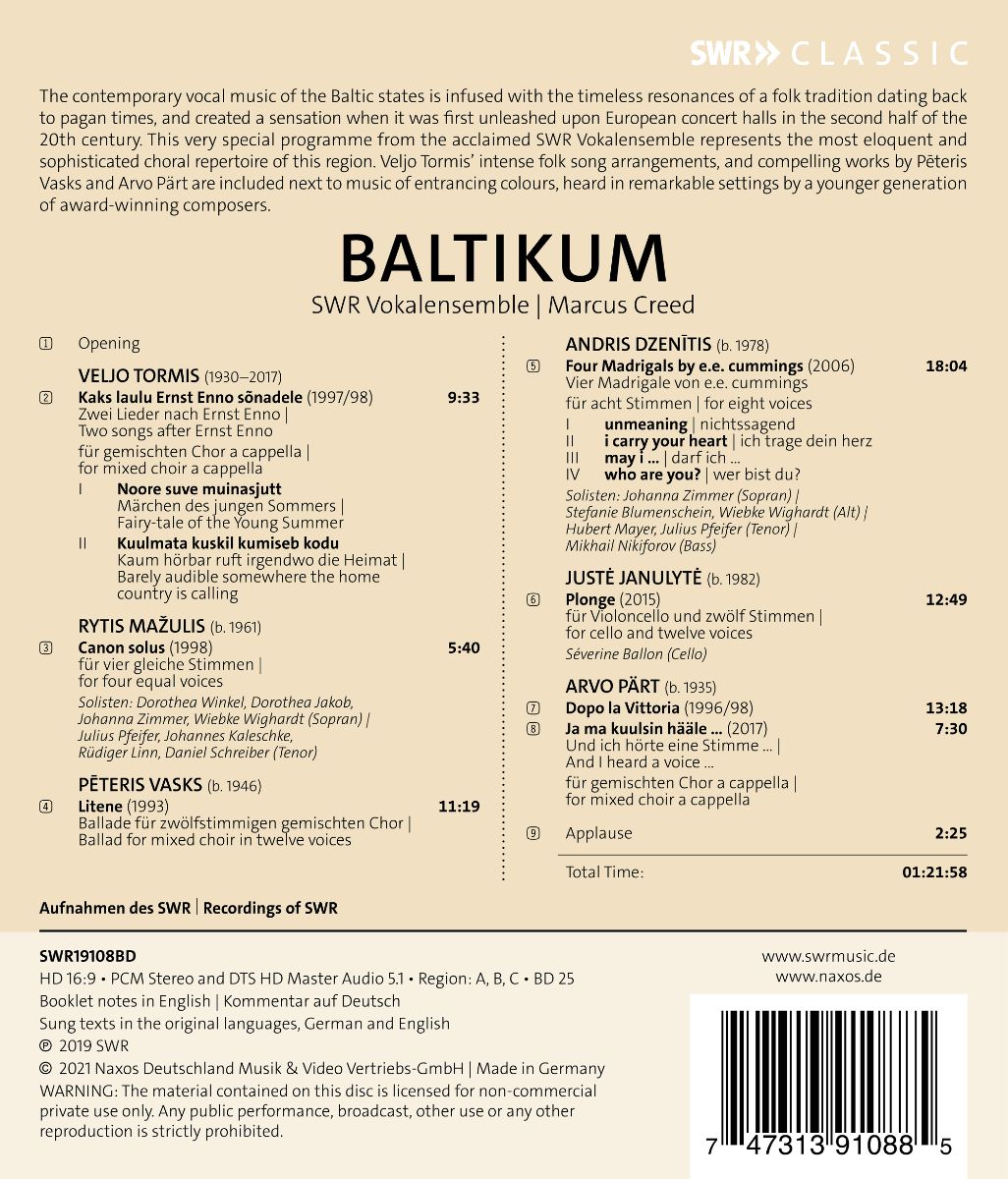 Die aktuelle Vokalmusik der baltischen Staaten ist durchdrungen vom zeitlosen Klang der Volksmusik-Traditionen, die bis in vorchristliche Zeiten zurückreichen und in der zweiten Hälfte des 20. Jahrhunderts, speziell über die Musik Arvo Pärts, in den europäischen Konzertsälen für Furore sorgte. Dieses ganz besondere Programm des renommierten SWR Vokalensembles repräsentiert das eloquenteste und anspruchsvollste Chorrepertoire dieser Region. Veljo Tormis' intensive Volksliedbearbeitungen und fesselnde Werke von Pēteris Vasks und Arvo Pärt stehen neben Musik von hinreißenden Klanggfarben, die in bemerkenswerten Vertonungen einer jüngeren Generation preisgekrönter Komponisten erklingt.