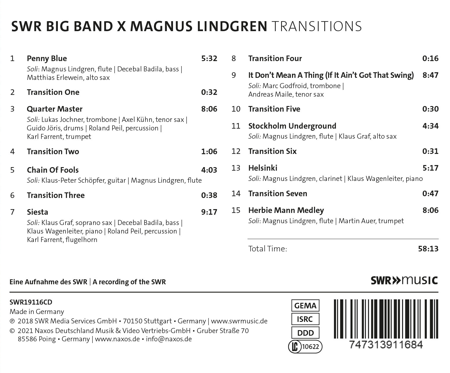 Der schwedische Saxophonist, Flötist, Komponist und Arrangeur Magnus Lindgren ist seit 2018 Artist-in-Residence bei der SWR Big Band. Zusammen haben sie 2018 das Album „Transitions“ produziert, das zunächst nur digital, jetzt auch auf CD erscheint. Lindgren war der erste Jazz-Musiker, der die Musik für den Nobel-Preis-Bankett (2003) nicht nur interpretieren, sondern auch komponieren durfte - eine der größten Ehren für einen schwedischen Musiker. Sein frischer, virtuoser Stil vereint Einflüsse des klassischen und modernen Big-Band-Ära. Neben zahlreichen Eigen-Kompositionen enthält das Album auch Klassiker wie „Chain of Fools“, „Siesta“ und den Ellington-Klassiker „It don´t mean a thing (if it ain´t got that swing)“.