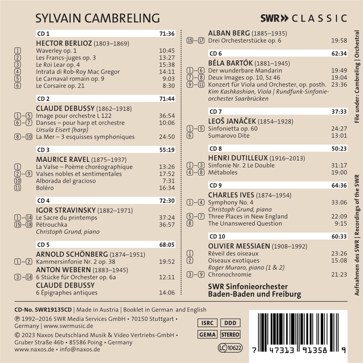 Diese üppige 10-CD-Box erscheint anlässlich des 75. Geburtstag des französischen Dirigenten Sylvain Cambreling. Sie enthält Kompositionen von Hector Berlioz, Claude Debussy, Maurice Ravel, Igor Strawinsky, Arnold Schönberg, Béla Bartók, Leoš Janacek, Henri Dutilleux, Charles Ives und Olivier Messiaen. Ein Großteil der Aufnahmen erscheint hier zum ersten Mal auf Tonträger. Es spielen das SWR Sinfonieorchester Baden-Baden und Freiburg und das Rundfunk-Sinfonieorchester Saarbrücken. Cambreling hat bis heute an die 120 Opern dirigiert und die Zahl der von ihm aufgeführten sinfonischkonzertanten Stücke geht gegen 1000.