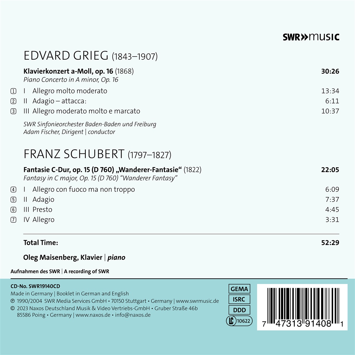 Diese Neuveröffentlichung aus dem SWR-Archiv bringt zwei Werke wieder zu Gehör: das Klavierkonzert a-Moll von Edward Grieg und die „Wanderer-Fantasie“ von Franz Schubert mit dem Ausnahmepianisten Oleg Maisenberg und (beim Konzert) dem SWR Sinfonieorchester Baden-Baden und Freiburg unter Adam Fischer in Aufnahmen von 2004 und 1990.
