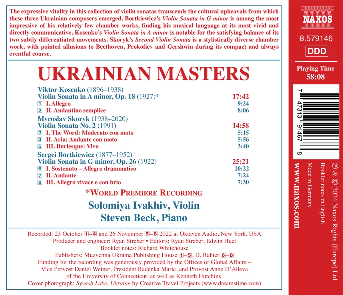 Sergei Bortkiewiczs Violinsonate in g-Moll gehört zu den beeindruckendsten seiner relativ wenigen Kammermusikwerke und zeigt seine musikalische Sprache von ihrer lebendigsten Seite. Viktor Kosenkos Violinsonate in a-Moll zeichnet sich durch die gelungene Ausgewogenheit ihrer beiden subtilen Sätze aus. Myroslaw Skoryks zweite Violinsonate ist ein stilistisch vielfältiges Kammermusikwerk, das in seinem kompakten und stets ereignisreichen Verlauf Anspielungen auf Beethoven, Prokofjew und Gershwin enthält.