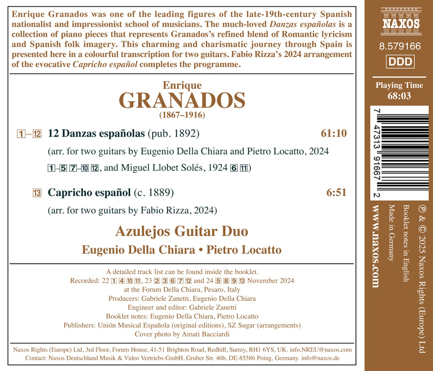 Enrique Granados war eine der führenden Figuren der spanischen nationalistischen und impressionistischen Musikschule des späten 19. Jahrhunderts. Die beliebte „Danzas españolas“ ist eine Sammlung von Klavierstücken, die Granados' raffinierte Mischung aus lyrischer Romantik und spanischer Volkskunst widerspiegelt. Diese charmante und charismatische Reise durch Spanien wird hier in einer farbenfrohen Transkription für zwei Gitarren präsentiert. Fabio Rizzas Arrangement des stimmungsvollen „Capricho español” aus dem Jahr 2024 rundet das Programm ab. Enrique Granados’ „Danzas españolas” sind seit langem als Sammlung von Klavierstücken sowie in Arrangements für Orchester und Gitarrensolo sehr beliebt. 1924 arrangierte der Gitarrist Miquel Llobet zwei der Danzas für ein Duo um und davon ließen sich die beiden italienischen Musiker des Azulejos Guitar Duo inspirieren. Sie nutzen den erweiterten Ausdrucks- und Dynamikbereich, den diese Kammermusikbesetzung bietet, um eine hervorragende neue Komplettfassung dieses beliebten Klassikers nun für Gitarrenduo zu schaffen. Eugenio Della Chiara hat bereits vier Alben aufgenommen, zuletzt die Gitarrenwerke von Gaspar Cassadó und Frederic Mompou. Della Chiara ist seit 2005 künstlerischer Leiter der Kammermusikreihe MUN – Music Notes in Pesaro. Im Jahr 2024 wurde er zum ordentlichen Professor für Gitarre am Conservatorio di Musica Lucio Campiani in Mantua ernannt. Pietro Locatto hat mehrere internationale Wettbewerbe gewonnen, darunter den ersten Preis beim Gianni Bergamo Classic Music Award in Lugano. Er arbeitete mit der Filarmonica Arturo Toscanini in Parma und dem Orchestra Sinfonica d’Este in Ferrara zusammen und trat bei Festivals in Italien, Europa, Australien und Mexiko auf. In den letzten Jahren hat er sich auf Aufnahmeprojekte konzentriert, die vom originalen spanischen Repertoire des frühen 20. Jahrhunderts bis zu Bach-Transkriptionen und Werken von Castelnuovo-Tedesco und Barrios reichen.